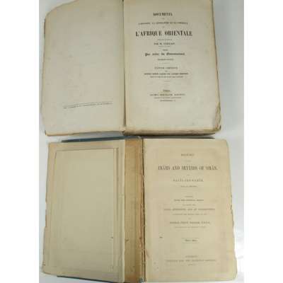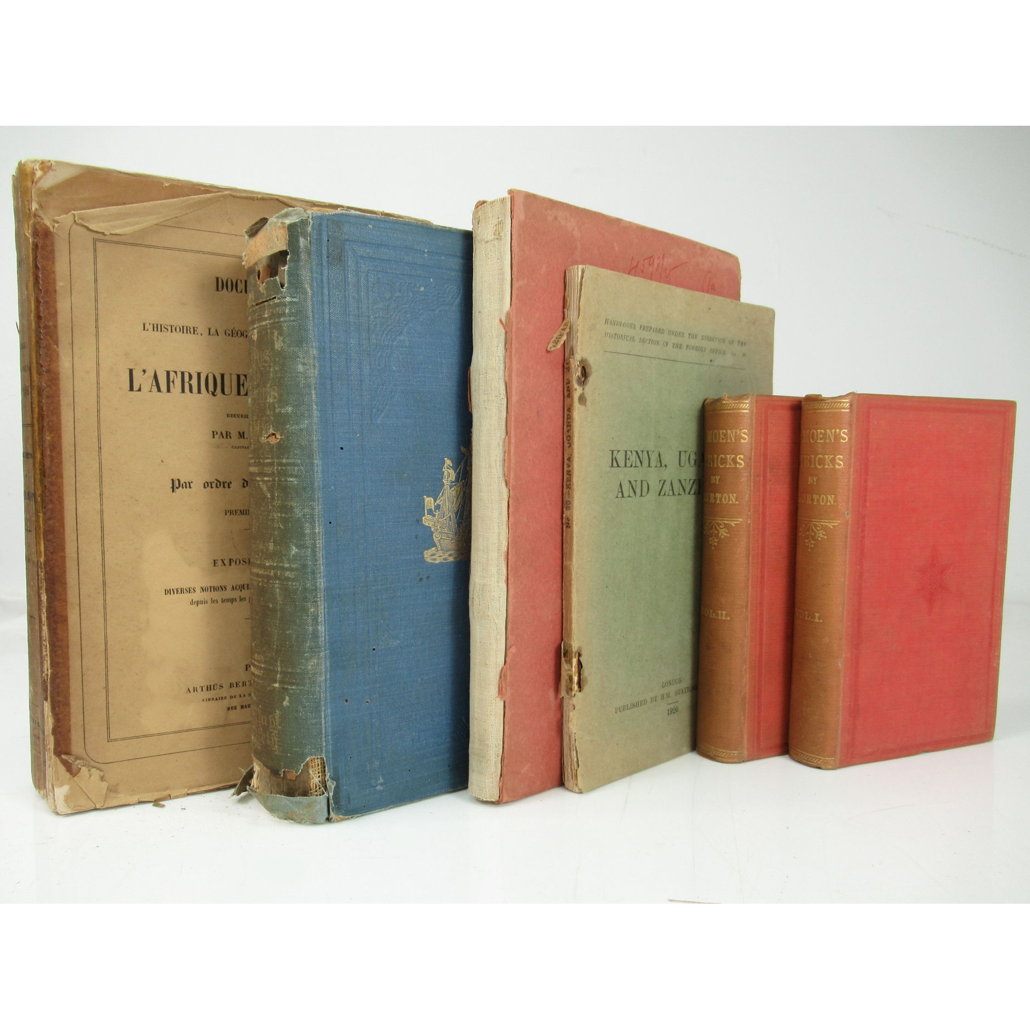 Documents sur l'Histoire, La Géographie et le Commerce de l'Afrique Orientale... Paris: Arthus Bertrand, [1856?] 8vo, part one only, half-title, 1 plan, folding table, original wrappers, lower wrapper detached and chipped, some foxing; [The British Foreign Office] Kenya, Uganda and Zanzibar. London: HMSO, 1920. 8vo, original green paper wrappers, bookplate; [Anonymous] The Kenya Manual, 1924. Nairobi: The East African Standard, Limited, 1924. 8vo, original pink printed boards, lacking spine, notation in red ink to upper cover, bookplate; Badger, George Percy History of the Imams and Seyyids of 'Oman by Salîl-Ibn-Razîk... London: Hakluyt Society, 1871. 8vo, original blue cloth gilt, bookplate, worn with some browning; Burton, Richard F., translator Camoens: The Lyricks. London: Bernard Quaritch, 1884. 2 volumes, 12mo, original red cloth gilt (6)