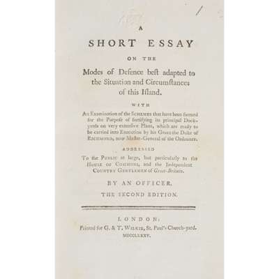 London: G. & T. Wilkie, 1785. Second edition, 8vo, [ESTC T79893]; [bound with] [Lennox, Charles] An Answer to a Short Essay on the Modes of Defence... London: J. Almon, 1785. 8vo, [ESTC T77301]; [bound with] [Glenie, James] A Reply to the Answer to a Short Essay... London: G. & T. Wilkie, 1785. 8vo, [ESTC T79894]; in contemporary tree calf, a little light foxing, bookplates, blindstamps of [Shirburn Castle] South Library to a few leaves