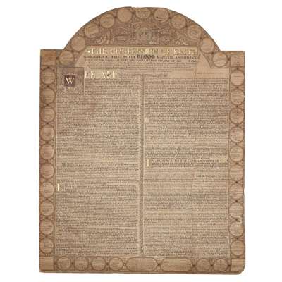 985 x 795mm., engraved facsimile of the copy presented to the Advocates’ Library by William Aytoun, junior, in 1703 (stated in an oval in the border at the top), with yellow and red hand-colouring, highlighted in gold, arched top, mounted on fabric, tear repaired, slight loss at corners