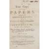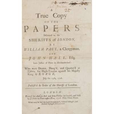 Derwentwater, James, Earl of. The Speech. Folio, pp.3-5, lacking title-page, [ESTC N37205]; [Earl of Mar] To all True-Heared Scotsmen, whether Soldiers or Others. Perth: Robert Freebairn, 1715. Folio, disbound, sellotape to inner margin of title and final recto, [ESTC N40187]; [Tenison, Thomas] Certain Propositions humbly offered to the Consideration of a Person presumed to think too favourably of the present Rebellion against King George. London: Printed for J. Roberts, 1715. Folio, drop-head title, 2pp., sellotape 'strengthening' to inner margin, [NOT RECORDED IN ESTC]; [Oxburgh, Henry] A True Copy of the Paper delivered to the Sheriffs of London. [London, 1716], Folio, 3pp., [ESTC N50992], sellotape 'strengthening' to inner margin; Paul, William. A True Copy of the Papers delivered to the Sheriffs of London by William Paul... and John Hall... who were drawn, hang'd and quarter'd at Tyburn. London: A. Bell, J. Phillips, 1716. Folio, 8pp., disbound, sellotape repair to inner margin of title, [ESTC T74025]; Bradshaw, James. A True Copy of the Paper read by Mr James Bradshaw... just before his Execution. [London, 1746]. Folio, 3pp., drop-head title, disbound, sellotape repair to inner margin of title, [ESTC T51857], Gascoigne, Richard. A True Copy of the Paper delivered to the Sheriffs of London by Richard Gascoign, at the place of Execution, May the 25th, 1716. Folio, pp.3-5, lacks title, [ESTC N492902], disbound, sellotape repair to inner margin of B1; Hoey, Abraham van A Second Letter from M. van Hoey, the Dutch Ambassador, to the Duke of Newcastle To excuse his sending M. D'Argenson's Letter in favour of the Rebels. London: M. Cooper, 1746. Folio, 7, [1]pp., sewn, small hole to title without loss, title frayed, sellotape repair to inner margin of title and final page, [ESTC T301280 - BL copy only]; Act of Parliament. An Act to alter and amend an Act (intituled, An Act for annexing certain forfeited Estates in scotland...), pp. 1479-1482), disbound; and an incomplete copy of Articles of Union. 1706 (pp. 1-16), some with contemporary name of Amb. Pimloe on title, (10)