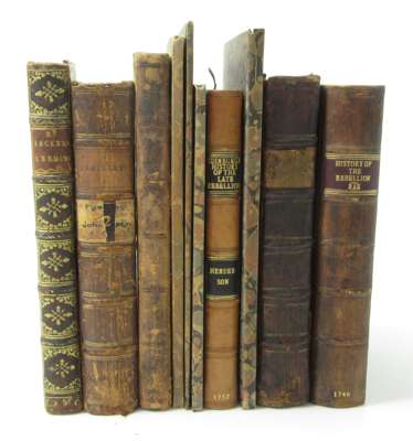 The History of the Rebellion. London: A. Millar, 1746. Second edition, contemporary calf, rebacked; [Secker, Thomas] Nine Sermons preached... on occasion of the Late War and Rebellion. London: R. Rivington, 1758, [ESTC T147665], bookplate of Philip Earl Stanhope, contemporary calf, spine gilt, slightly rubbed; [Anon.] The History of the Rise, Progress and Extinction of the Rebellion in Scotland in the years 1745 and 1746. London: R. Thomson, [n.d.], [ESTC T68821], contemporary calf, rebacked; [Pamphlets - Vernon, Edward] Original Letters to an Honest Sailor. London: R. Thomas, [1746], [ESTC T64412]; [Vernon, Edward] A Specimen of Naked Truth, from a British Sailor. London: W. Webb, 1746, [ESTC T49588]; Dean, John A Narrative of the Shipwreck of the Nottingham Galley. 1726, [ESTC T135935]; [Anon.] Excise: Being a Collection of Letters. London: W. Mears, 1733, [ESTC T58794]; Murray, John Genuine Memoirs of John Murray Esq. London: J. Wilford, 1747, [ESTC T87633]; [Fielding, Henry] A Dialogue between a Gentleman of London. London: M. Cooper, 1747., [ESTC T89864]; [Anon.] A Short Account of the late Application to Parliament made by the Merchants of London upon the Neglect of their Trade. London: T. Cooper, 1742, [ESTC T17522]; [Pulteney, William, Earl of Bath] A Letter from a Member of Parliament.. concerning the Sum of 115,000 l. London: J. Walker, 1729, [ESTC N66233], contemporary calf, rubbed; Bolingbroke, Viscount A Letter to Sir William Windham. London: A. Millar, 1753, engraved portrait, contemporary calf, rubbed; Ford, T. By Authority of the Sheriffs. An Account of the Behaviour of William, late Earl of Kilmarnock. Printed for J. Hinton, 1746, 4to, later boards, a few words trimmed, [ESTC T167014]; [Anon.] The Life of Archibald Mc'Donald of Barisdale. Edinburgh Printed, London Reprinted, 1754, engraved portrait, later boards, [ESTC T40943]; [Anon.] A Candid and Impartial Account of the Behaviour of Simon Lord Lovat. London: J. Newbery, 1747, marbled boards; Henderson, Andrew The Edinburgh History of the late Rebellion. London: for the author, 1752. Fourth edition, contemporary calf, [ESTC T110139]; Ferguson, Chancellor The Retreat of the Highlanders through Westmorland in 1745. Kendal, 1889, plates, marbled boards (10)