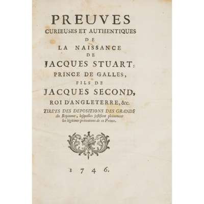 Prince de Galles. [s.l. : s.n.] 1746, 4to, [4],28; [Irish] Les Irlandois. Poëme dedié a Son Altesse Serenissime Edouard Stuard, Prince de Galles. [Paris, 1745], 4to, 4pp.; [James II, King] L'ombre de Jacques II. Ou le songe de George, Roi d'Angleterre. Poeme. [Paris, 1745], 4to, 4pp.; [Thaylord, Lord] Harangue du Lord Thaylord, an nom du Parlement d'Ecosse. [France : s.n. 1745], 4to, 7, [1],pp.; [Stuart, Charles Edward] Ode sur l'entreprise du Prince de Galles. [Paris, 1745], 4to, 4pp.; [Anon.] A Son Altesse Royalle le Prince Edouard. En lui présentant plusieurs Ecrits sur son Expédition. 4to, 1p., [untraced]; [Mary Theresa, Queen of Hungary] Reponse de la Reine de Hongrie aux plaintes de George II. [Paris, 1746], 4to, 8pp.; Stuart, Charles Edward, Prince Traduction d'une lettre écrite par le Prince Charles-Edouard, à son Pere Jacques III. [S.l., 1745], 4to, 4pp.; [Anon., Untraced] Avanture Singuliere, arrivée en Angleterre, au mois de May 1751. [S.l., ?1751], 4to, 7, [1]p., 9 pamphlets in one volume, early 19th century half calf, lettered in gilt on spine "Traites sur le Pretendant", bookplate of Baron Northwick, occasional slight spotting, rubbed