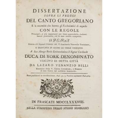 Dissertazione sopra le Preggi del Canto Gregoriano... dedicata.. a sua Altezza Reale Eminentissima il Signor Cardinale Duca de York... con le Regole Principali. Frascati: Stamperia dello Stesso Seminario, 1788. First edition, 4to, xvi, 230; xxxii, [2 ], with errata leaf at end, contemporary blue marbled boards, spine worn (with later label),