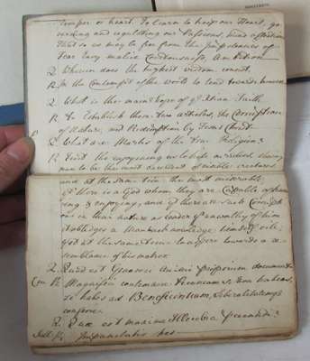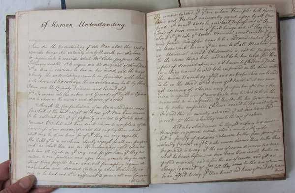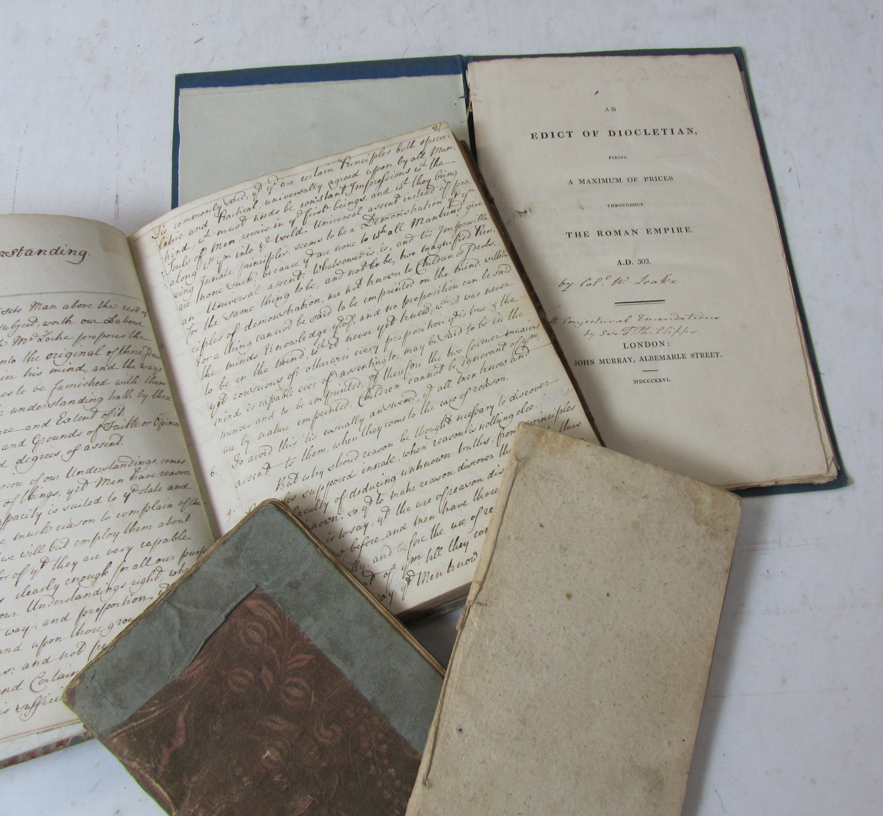 Three manuscript volumes, notes on human understanding; classical culture and the Greek language; philosophical notes in dialogue form English and Latin; alll in original boards; Four printed volumes with ink notes and marginalia by Sir Thomas Phillipps, to include [Leake, Col. W. An edict of Diocletian... London,1826. 8vo, contemporary boards; Orford, Lord Reminiscences. London, 1818. 12mo, contemporary calf gilt, later 19th century manuscript notes on front endpaper, foxing; Pertz, G.H. Uber die gedruckten ablassbriefe von 1454 und 1455. Berlin, 1857. 8vo, presentation copy to Sir Thomas Phillipps from the editor, original boards, loose ms inserted; and another (7)