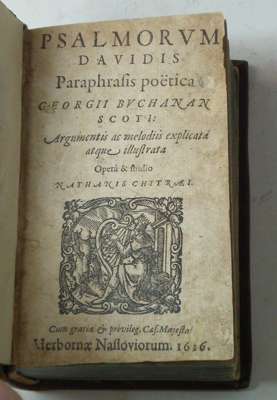 Poemata quae extant. Leiden: Elzevir, 1628. 24mo, engraved title, contemporary vellum, lacking endpapers, vellum soiled; [Idem] Psalmorum Davidis paraphrasis poetica. Herborn, 1616. 24mo, printer's device on title, [bound with] Paraphrasin psalmorum collectanea. Herborn, 1616. 24mo, printer's device to title, 18th century red calf gilt, dutch floral endpapers; Scott, Sir W. The border antiquities of England and Scotland. 1814. 2 volumes, 4to, additional engraved titles, 93 engraved plates, tissue guards, contemporary calf gilt, neatly rebacked, corners slightly rubbed, a clean copy; Swan, J. Views on the Clyde. [c.1880]. 4to, 24 engraved plates, contemporary half calf, lacking title; Hooker, D. Perthshire illustrated. 1844. 4to, additional engraved title and 67 engraved plates, original cloth, worn, hinges weak; Geddie, J. Illustrations of the scenery of the River Tay. 1891. Folio, plates, original cloth; Milner, Edith Records of the Lumleys of Lumley Castle. 1904. 8vo, original buckram, t.e.g., spine faded & very slightly rubbed; Geddie, J. The water of Leith. 1896. Folio, plates, original cloth; Dixon, J.H. Pitlochry past and present. Pitlochry, 1925. Dust-jacket; Butler, D. The ancient church and parish of Abernethy. 1897. 4to, plates, original cloth, slightly faded; Tullibardine, Marchioness of A military history of Perthshire 1660-1902. Perth, 1908. 8vo, plates, original cloth, spine slightly faded; Ellice, E.C. Place-names of Glengarry and Glenquioch., 1931. 8vo, original cloth; Paterson, D. A new and accurate description of all the direct and principal cross roads in England and Wales. 1808. 8vo, folding map, cloth; James, H.E.M. Extracts from the pedigrees of James of Barrock. Exeter, 1913. 4to, Privately Printed, folding pedigrees, original cloth-backed boards, binding slightly soiled and rubbed; and 7 others (22)