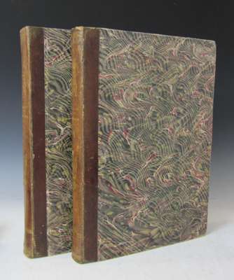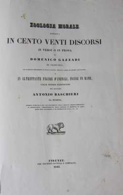 Zoologia morale, esposta in cento venti discorsi in versi o in prosa... Florence: Vincenzo Batelli, 1843 [-1846]. Folio, 2 volumes, half title, 92 [of 93] engraved plates, contemporary calf backed boards, replacement endpapers, backstrips rubbed, lacking the llama plate, gnu plate torn with loss, some other tearing to text leaves [no loss], spotting, many tissue guards removed (2)