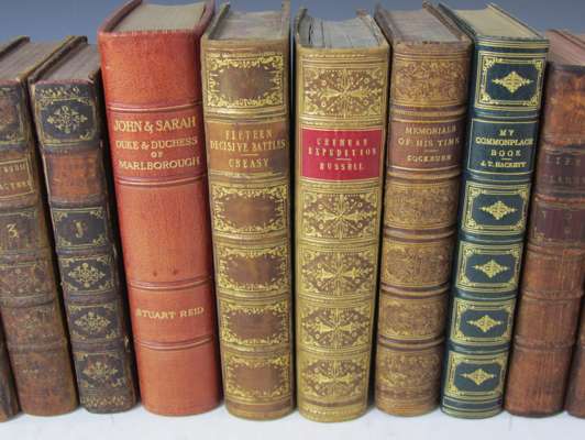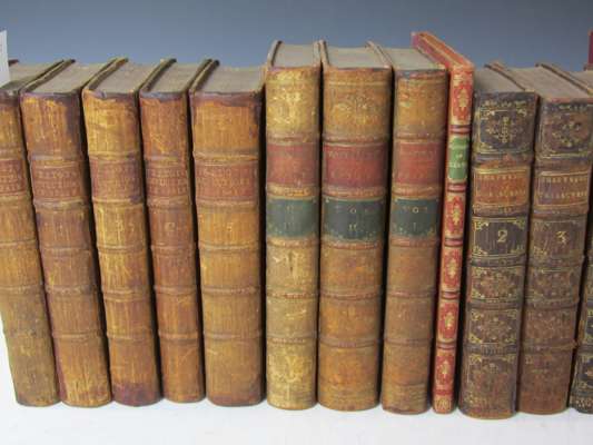 The essays, edited by Peter Coste. London, 1776. 3 volumes, 8vo, contemporary calf; Vertot, l'abbé de The history of the revolutions in Spain. London, 1724. 3 volumes in 5, 8vo, contemporary panelled calf; Shaftesbury, Earl of Characteristicks of men, manners, opinions, times. [London], 1732. 3 volumes, 8vo, engraved frontispiece and title vignettes, contemporary calf, rubbed; and 8 others, leather bound, (19)
