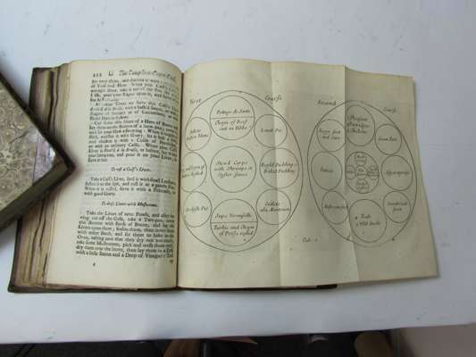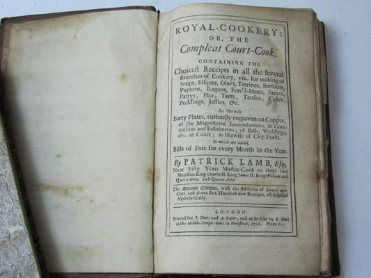 Royal Cookery: or, the compleat court-cook. London: J. Nutt & A. Roper, 1716. Second edition, 8vo, 40 folding engraved plates, contemporary panelled calf, title slightly dust-soiled, head of spine slightly rubbed, hole just affecting plate at p. 140, a few spots and small stains