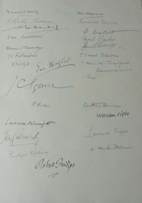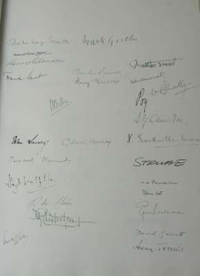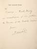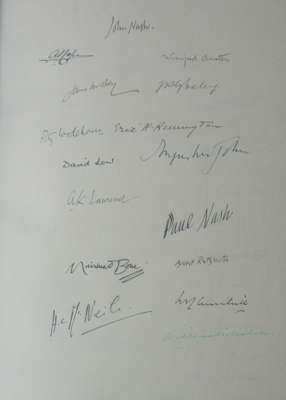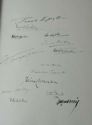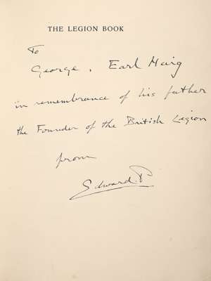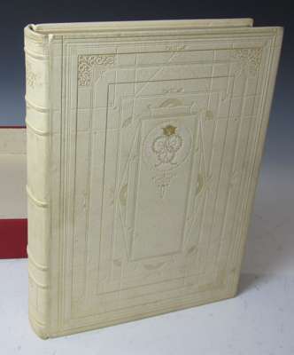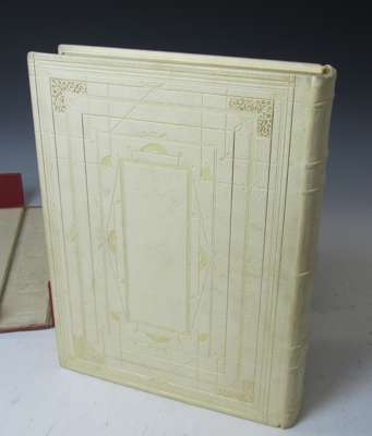 The Legion book. London: Privately printed, 1929. 4to, limited to 100 copies, all for presentation by H.R.H. the Prince of Wales, this copy inscribed to George, Earl Haig, also signed on specially bound in blank leaves by artists and authors including Humbert Wolfe, Stanley Spencer, Eric Ravilious, W. Rothenstein, Eric Gill, Eric Dagliesh, J.C. Squire, Laura Knight, John Galsworthy, Rudyard Kipling, Robert Bridges, A.E. Coppard, W. Walcot, Edward Bawden, Bernard Partridge, Edmund Blunden, T. Hamilton Lawford, C. Ricketts, William Orpen, Laurence Binyon, W. Heath Robinson, John Nash, James McBey, P.G. Wodehouse, David Low, A.K. Lawrence, Muirhead Bone, H.C. McNeile, Winifred Austen, Eric H. Kennington, Augustus John, Paul Nash, Albert Rutherston, Winston Churchill, William Nicholson, Sheila Kaye-Smith, David Robertson, George Clausen, Frank Short, Mark Gertler, Henry Newbolt, John Drinkwater, D. Llewellyn, D.Y. Cameron, John Lavery, Gilbert Murray, Margaret Kennedy, Hugh Walpole, G.K. Chesterton, V. Sackville-West, Strube, Max Beerbohm, Rebecca West, David Garnett, Jacob Epstein, Stephen Gooden, Clare Leighton, W.H. Davies, Charles Lamb, Bliss Carman, Aldous Huxley, Walter de la Mare, Edith Sitwell, Edgar Wallace, Arnold Bennett, Sarah Gertrude Millin; plates, some signed by the artist, elaborate white blind-stamped and gilt pigskin designed by Charles Ricketts and bound by Wood of London, folding cloth box