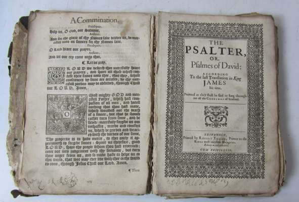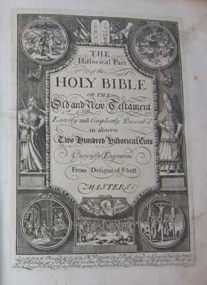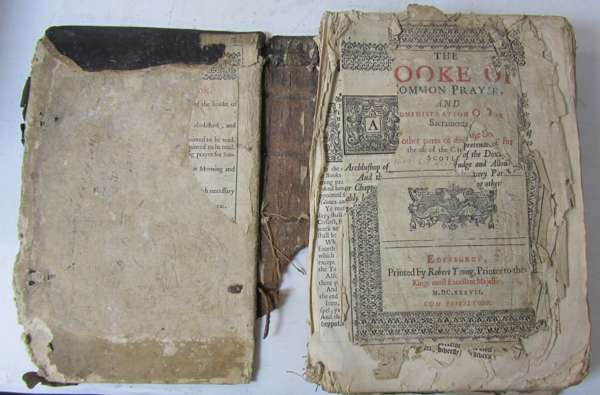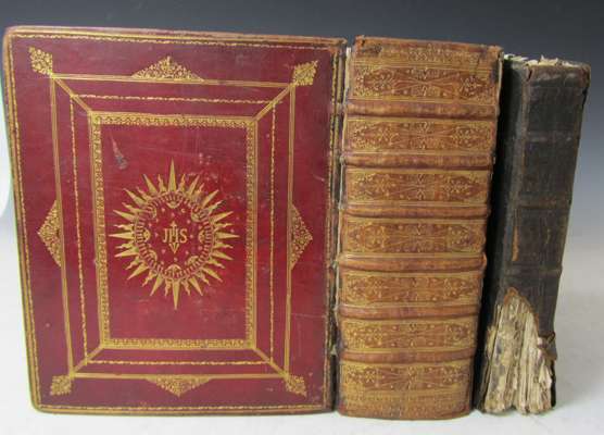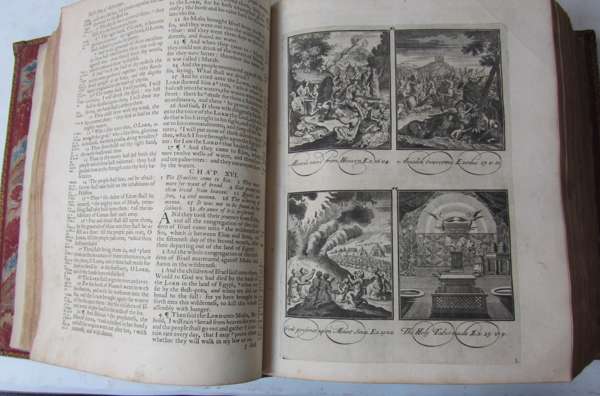 Book of Common Prayer, Oxford: J. Baskett, 1719; The Holy Bible. Oxford: J. Baskett, 1723; 4to, additional engraved title, frontispiece portrait, numerous engraved plates, contemporary panelled red morocco gilt, spine gilt, g.e., joints partially split; with a very defective copy of The Book of Common Prayer., Edinburgh: Robert Young, 1637 (2)