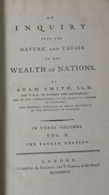 An inquiry into the nature and causes of the wealth of nations. London: A. Strahan & T. Cadell, 1786. Fourth edition, 3 volumes, 8vo, contemporary calf, slight worming to upper margin of preliminary leaves of volume 1 and at end affecting some letters from EE1, slight worming to upper margin of volume 2, Contents leaf in volume 3 misbound, rubbed, two joints split, lacking one label