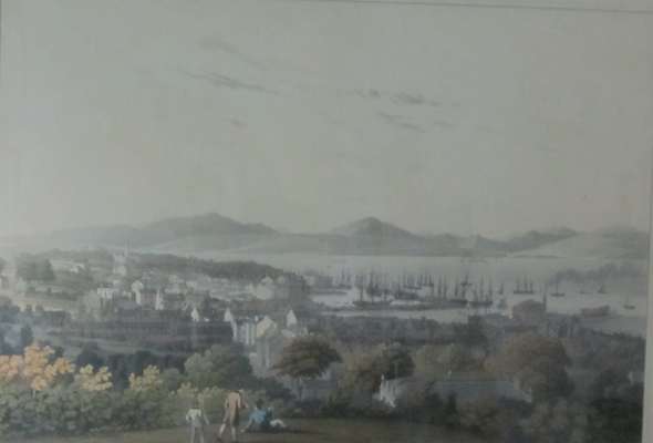 Twee-dail with the sherifdome of Etterick-Forrest called also Selkirk. [Amsterdam. c.1654]. Approx. 50 by 60cm, hand coloured, framed and double glazed, previous fold, some fading; Clark, J. The town of Greenock. London, 1824. Later printing, hand coloured, approx. 44 by 59cm, framed and glazed, trimmed to plate mark, repairs to upper edge, faded; Clark, J. Lanark. London, 1825. Hand coloured, approx. 39.5 by 57.5cm, mounted within plate mark [possibly trimmed], browning to edges, framed and glazed; and 3 other Clark views of Dundee [faded], Lanark and Peebles [foxed] (6)