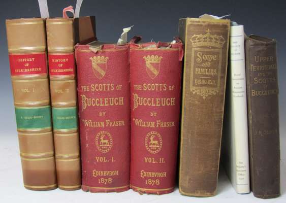 The history of Selkirkshire or chronicles of Ettrick Forest. Edinburgh, 1886. 4to, 2 volumes, number 242 of 250 copies, signed by the author, presentation copy from the author to a Rev. Taylor, portrait frontispieces, 2 folding maps, plates, modern half calf gilt; Buchan, J.W. A history of Peeblesshire. Glasgow, 1925. 8vo, 3 volumes, portrait frontispieces, original red cloth gilt, backstrips faded; [Millar, William] A survey of the province of Moray. Aberdeen, 1798. 8vo, presentation copy from the author, folding map [repaired], frontispiece, contemporary calf gilt, rubbed at edges; Jeffrey, Alexander The history and antiquities of Roxburghshire. Edinburgh, [c.1855]. 8vo, 4 volumes, original cloth gilt, faded; Grant, Ludovick a small manuscript receipt volume detailing various transactions relating to Ludovick Grant of Knockando, 1733-1784, contemporary vellum with ties, soiled; and 6 others (17)
