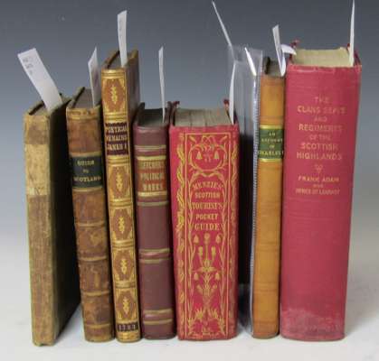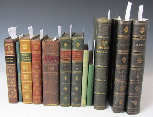 Scotland described. Edinburgh, 1799. New edition, 8vo, half title, folding map [linen backed], 19th century half calf gilt, rubbed, title and half title trimmed at lower edge; [Tytler, William] Poetical remains of James the First. Edinburgh, 1783. 8vo, contemporary calf, rebacked; Cunningham, Allan Sir Marmaduke Maxwell. London, 1822. 8vo, original boards, label worn; Foulis An account of the preservation of King Charles II. Glasgow: Robert & Andrew Foulis, 1766. 8vo, contemporary calf, rebacked, bookplate; Shepherd, Thomas Modern Athens. London, 1829. 4to, engraved title, engraved views, contemporary half morocco gilt, some foxing; Beattie, William Caledonia Illustrated. London: George Virtue, c. 1840. 4to, 2 volumes, engraved plates [lacking plate of Burns opposite page 177], pencil marks throughout, some marginal damage to plates opposite 102 & 105, later half morocco gilt, rubbed, foxing; and 13 others (20)