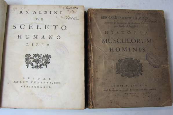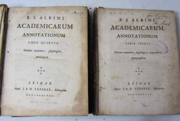 Academicarum annotationum. Leiden: J. & H. Verbeek, 1754-58. Parts 1-6 (of 8) in 2 volumes, 4to, 34 engraved plates, contemporary calf, worn; Idem De sceleto humano. Leiden: J. & H. Verbeek, 1762. 4to, contemporary calf, some dampstaining, neatly rebacked; Idem Historia musculorum hominis. Leiden: T. Haak & H. Mulhovius, 1734. 4to, 4 engraved plates, each with engraved outline plate, title soiled and frayed, lacks lower board, some spotting to all volumes (4)