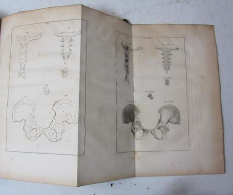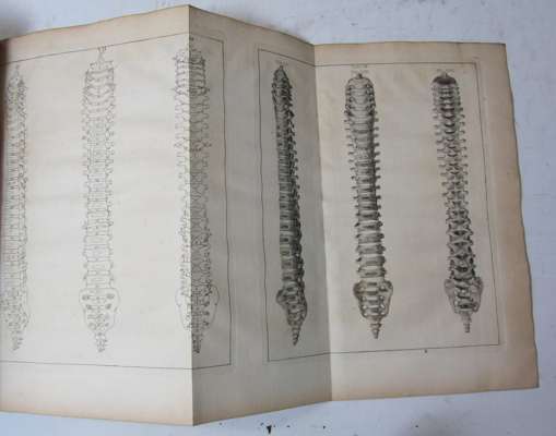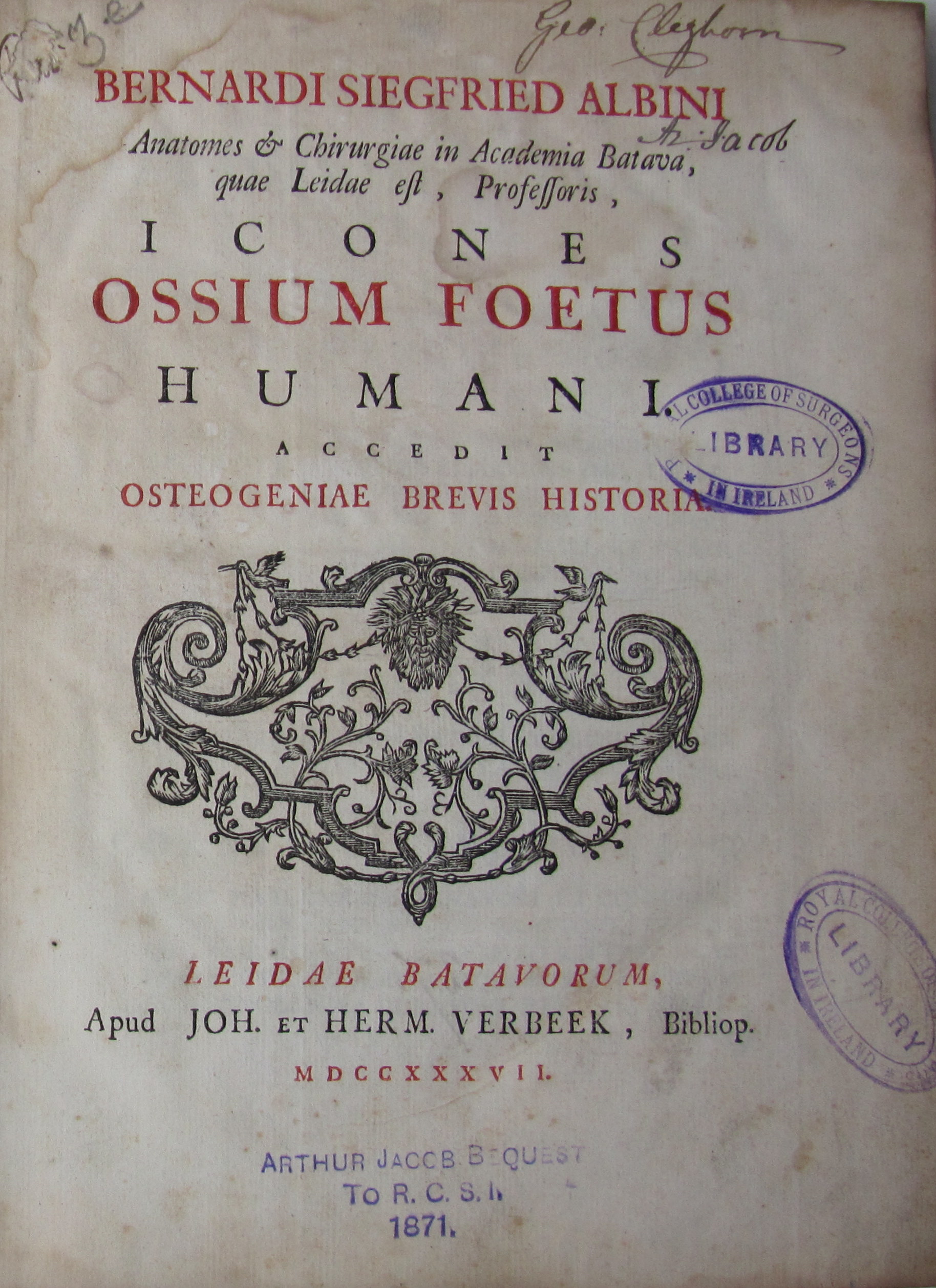 Icones ossium foetus humani. Leiden: J. & H. Verbeek, 1737. 4to, 16 folding engraved plates, each with accompanying outline plate, ownership inscription of George Cleghorn, contemporary calf, library stamp to title only, dampstained, most heavily at ends, worn, upper board detached, small hole to inner margin of title