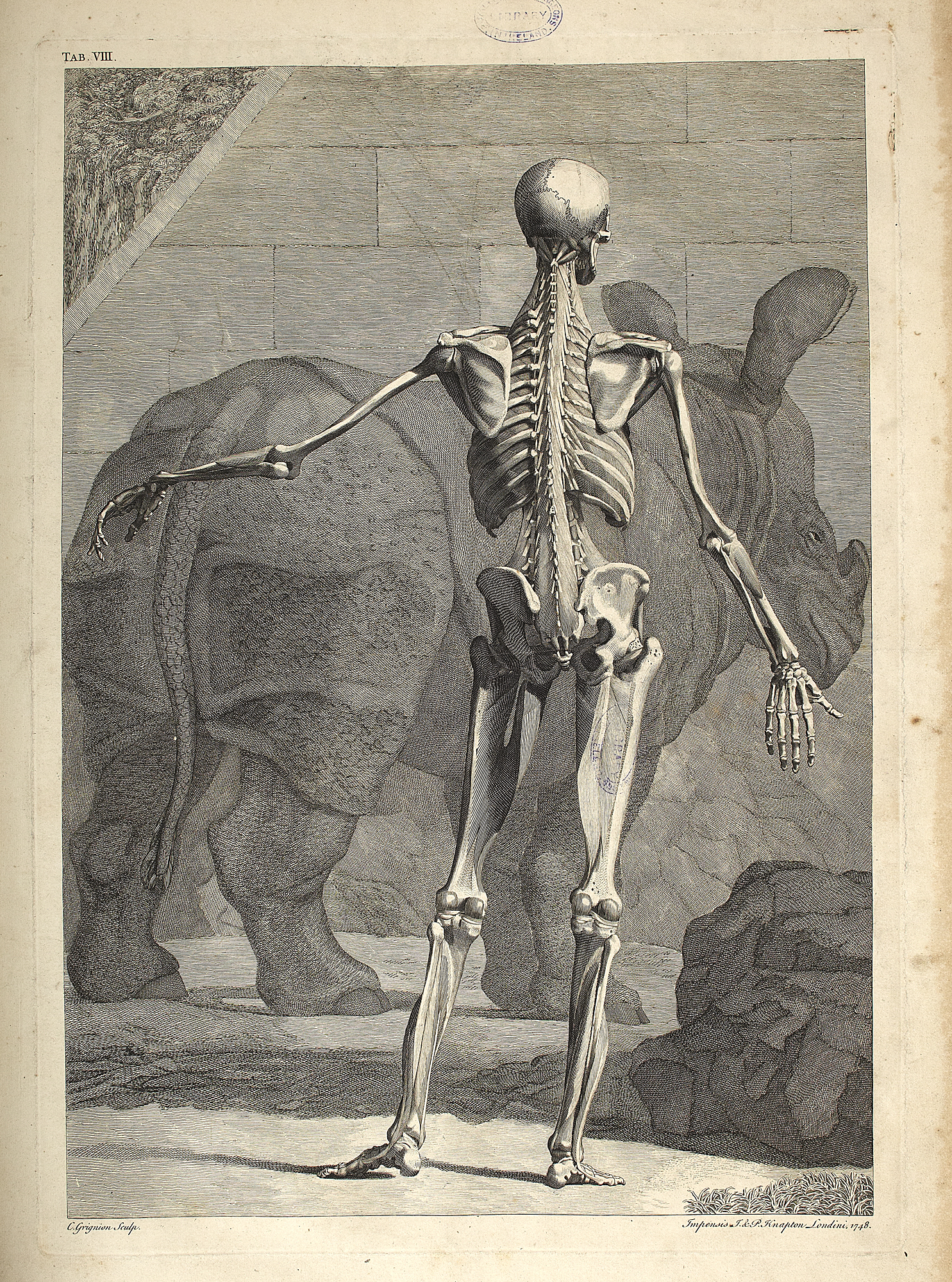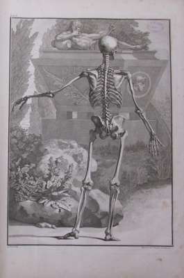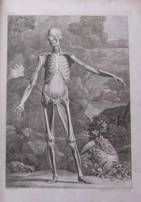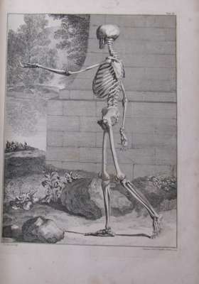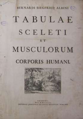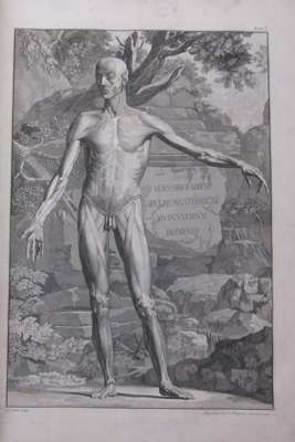 Tabulae sceleti et musculorum corporis humani. London J. & P. Knapton, 1749. Large folio, 40 engraved plates, including 12 outline plates, 15 leaves of text, 46 leaves of text, contemporary calf, plate 1 torn and repaired without loss, most plates with library stamp on the image, a few with stamp in the margin, a few with marginal tear, worn, covers detached