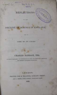 Reflections in the decline of science in England. London: B. Fellowes, 1830. First edition, 8vo, 4pp. advertisements at end, original boards, library stamps to title, uncut, spotting, especially to title, spine worn with loss of part of label, extremities rubbed, upper board detached