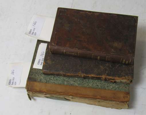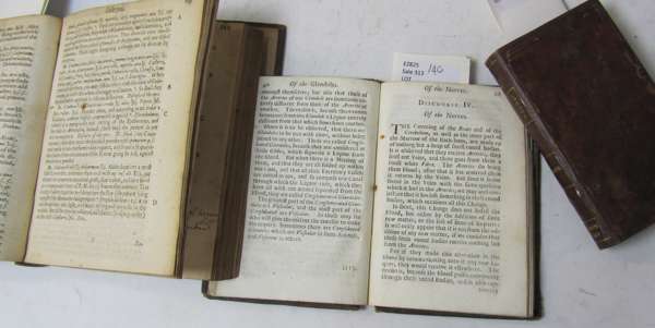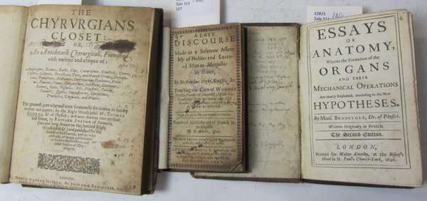 Essays of anatomy wherein the formation of the organs and their mechanical operations. London: printed for Walter Kettilby, 1696. Second edition, 8vo, adverts to rear, library stamps, ink marginalia, worming to lower right corner from pp.121 onwards, contemporary calf, worn, lacking foot of backstrip; Bonham, Thomas The chyrurgians closet. London: Edward Brewster, [1630]. 8vo, library stamps, title and first few leaves trimmed at lower edge [some loss to text], ink marginalia, later half calf, worn, boards loose; Digby, Sir Kenelm A late discourse made in a solemne assembly of nobles and learned men.... London, 1660. Third edition in English, 12mo, library stamps, soiled, contemporary calf, rebacked, new endpapers (3)