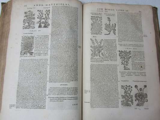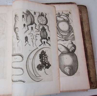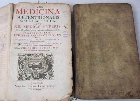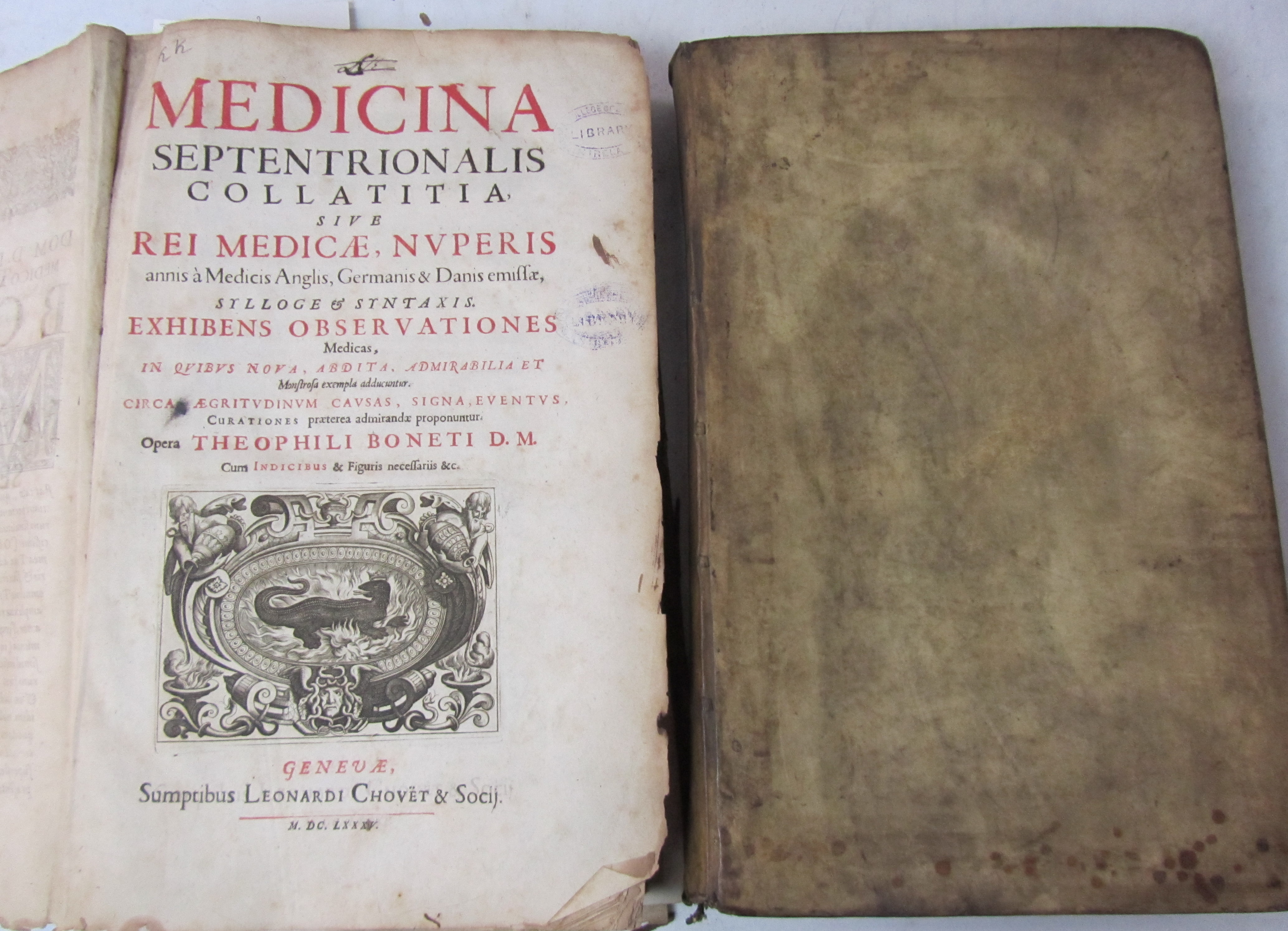 Medicina septentrionalis collatitia.... Geneva: Leonard Chovet, 1685. Folio, volume one [of two] only, half title, title in red and black, 12 engraved plates, library stamps, contemporary calf, worn, some spotting and soiling, boards loose, half title and title loose and creased, plates loose, bookplate of F. Hutcheson MD; Matthioli, Pietro Andrea [Les commentaires. ? Lyon, ?1572]. Folio, woodcuts, contemporary vellum, lacking title and one leaf before dedication, slight loss to last few leaves of index (2)