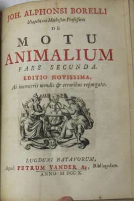 De motu animalium.... Leiden: Petrum Vander, 1710. New edition, 4to, 2 volumes bound in one, first volume lacking [engraved?] title, engraved dedication, 19 engraved folding plates, 5 folding, contemporary calf, worn, lacking upper board, no library stamps