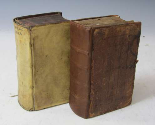 Opera omnia medica et chirurgica. Leiden: Daniel & Abraham Gaafbeeck, 1660. 8vo, engraved title, 4 engraved plates [one folding], library stamps, contemporary vellum, splitting at hinges, waterstaining along lower edge, nineteenth century ink inscription to title, twentieth century bookplate; and another copy in calf, professionally restored (2)