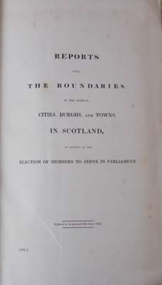 Reports upon the boundaries of the several cities, burghs and towns in Scotland in respect to election of members to serve in parliament. [Edinburgh], 1832. 4to, 71 maps [all towns represented in index], hand coloured in outline, original boards, rebacked in cloth, new label, offsetting to maps