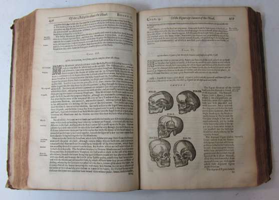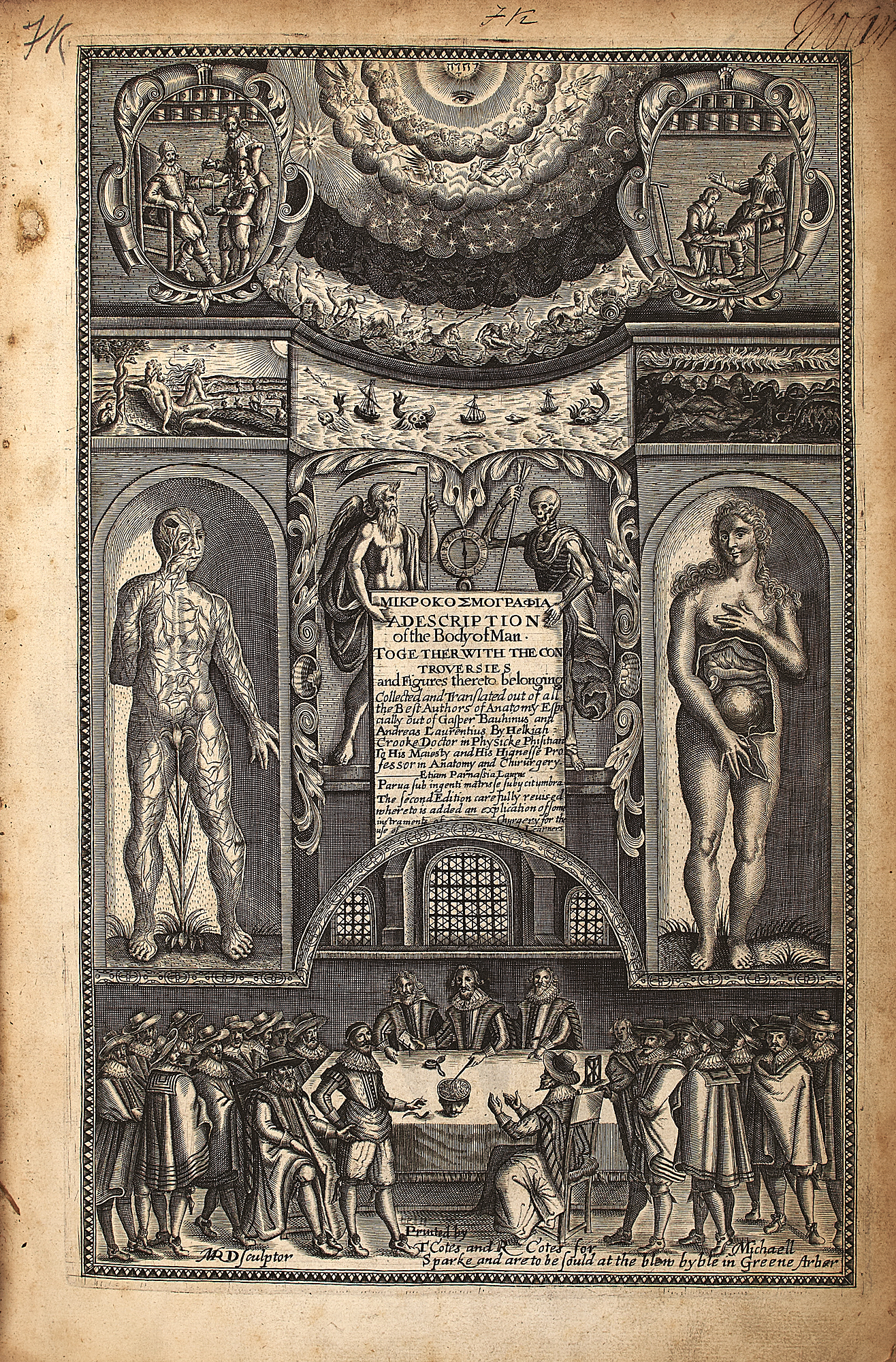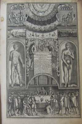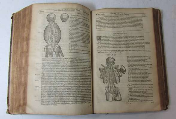 Microcosmographia, a description of the body of man... London: for Michael Sparke, 1631. Second edition, folio, 2 parts in one volume, [30] 110 [i.e. 108], 107-877, 888-1012; [4] 60 [2], engraved title, woodcut vignette to main title, woodcuts in text, "printer to the reader" misbound after second title, library stamps, contemporary calf, worn, rebacked, inner hinges repaired, ink inscriptions to endpaper and title, bookplate