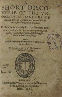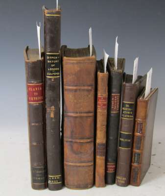 A physical directory... London: printed by Peter Cole, 1651. Folio, portrait frontispiece, library stamps, contemporary calf, rebacked, replacement endpapers, long 19th century manuscript notes on front endpaper [Wing C7542]; Cotta, John A short discoverie of the unobserved dangers... London: for William Jones, 1612. Small 4to, library stamps, calf, rebacked and repaired, replacement endpapers, A3 loose, foxing, header line torn from last 4 leaves [ESTC 5835] ; Cooke, James Mellificium chirurgiae, or the marrow of many good authors... London: T. Hodgkin for W. Marshall, 1685. Fourth edition, 10 [of 12] plates, lacking portrait frontispiece, worn calf, rebacked, contemporary ink inscription to endpaper, foxing throughout [Wing C6015]; Connor, Bernard Dissertationes medico-physicae... Oxford: H. Clements, 1695. 8vo, 3 parts in one volume, 2 plates, library stamps, contemporary calf, staining throughout, bookplate [Wing C5885]; Thruston, Malachi De respirationis usu primario, diatriba. London: for J. Martyn, 1670. 8vo, errata leaf, library stamps, contemporary calf, rebacked, replacement endpapers [Wing T1132]; Talbor, Sir Robert A rational account of the cause and cures of agues. London: R. Robinson, 1672. 16mo, library stamps, contemporary calf, rebacked, volume professionally restored [Wing T112]; Tachenius, Otto HIs clavis to the ancient Hippocratical physick... London: Thomas James, 1677. 4to, library stamps, foxing and burn marks throughout, contemporary calf, rebacked and repaired, replacement endpapers [Wing T97] (7)