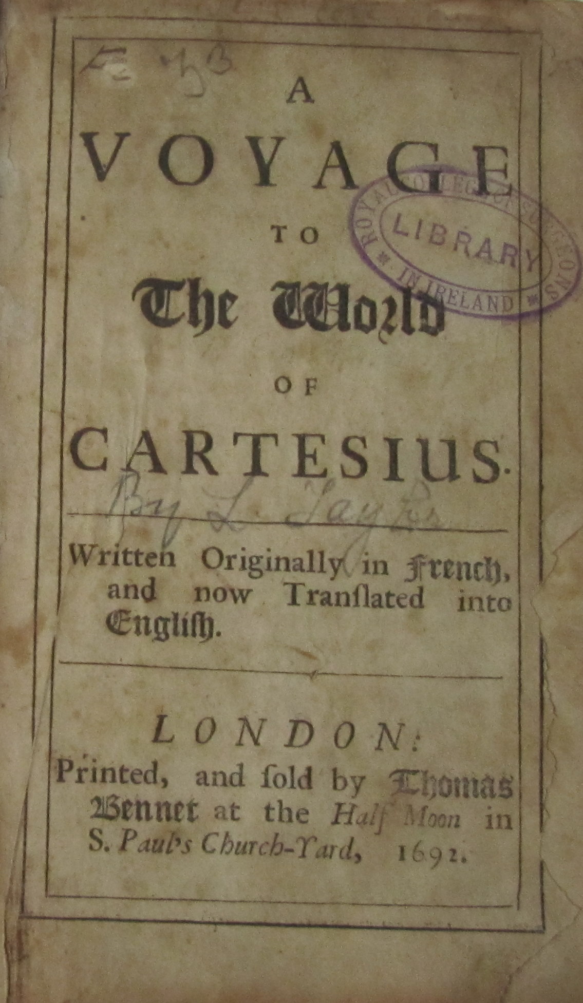 A voyage to the world of Cartesius. London: Thomas Bennet, 1692. First edition, 8vo, [xii], 298, [vi], illustrations, library stamp to title, contemporary calf, slight loss of fore-margin title, somewhat spotted, worn, covers detached