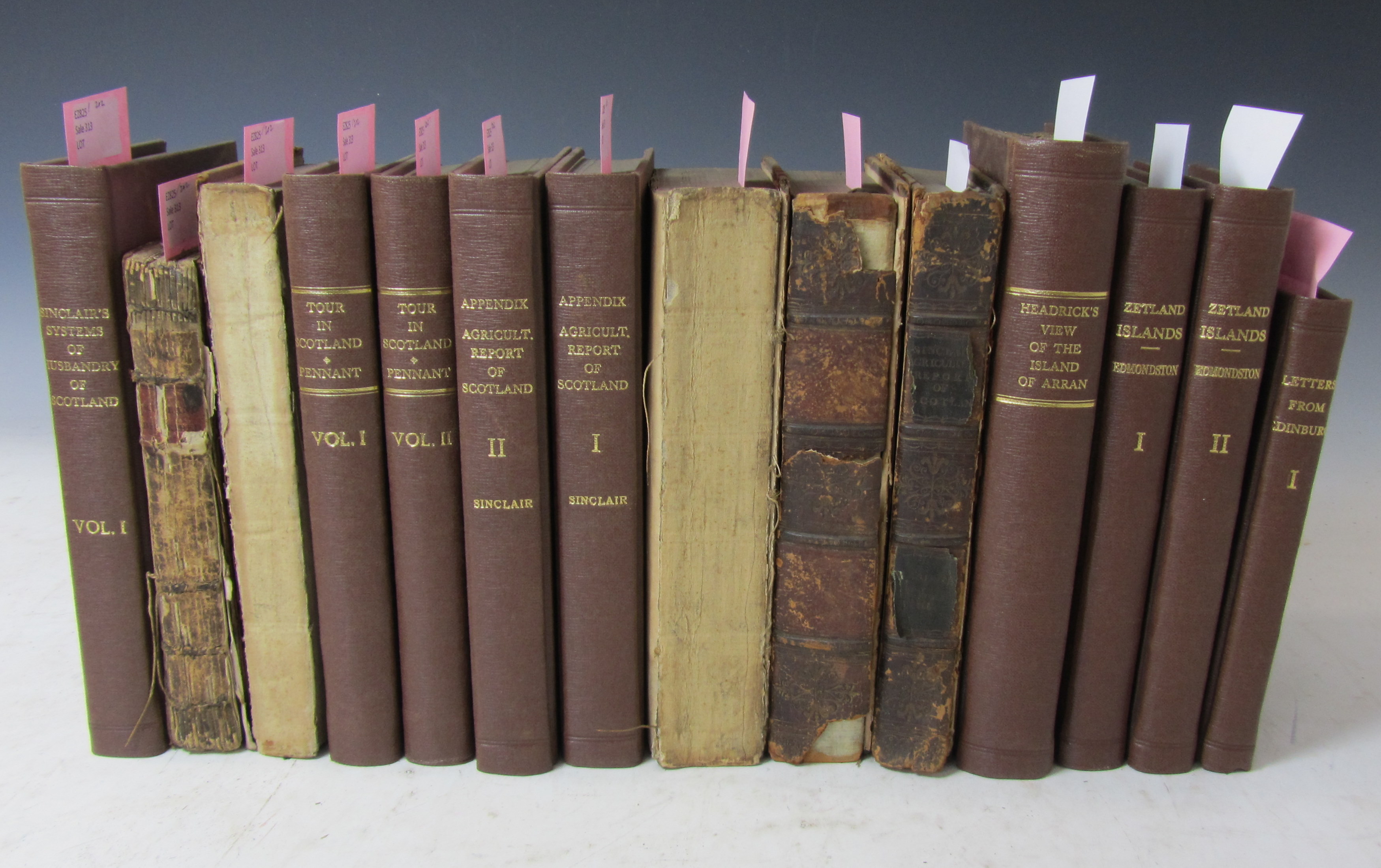 A view of the ancient and present state of the Zetland Islands. Edinburgh, 1808. 2 volumes, 8vo, engraved frontispiece, modern cloth, upper half of volume 1 title torn away; Headrick, James View of the mineralogy, agriculture, manufacturers and fisheries of the island of Arran. Edinburgh, 1807. 8vo, folding map, modern cloth; Sinclair, Sir John General report of the agricultural state and political circumstances of Scotland. Edinburgh, 1814. 5 volumes including Appendix, folding maps and plates, calf, 2 boards missing, and Appendix rebound in cloth; Idem An account of the systems of husbandry adopted in the more improved districts of Scotland. Edinburgh, 1814. 2 volumes, 8vo, engraved plates, volume 1 modern cloth, volume 2 calf, lacking upper cover; Heron, Robert Scotland described. Edinburgh, 1797. 12mo, folding map hand-coloured in outline, half-title soiled, old boards, lacking upper board; Pennant, Thomas A tour in Scotland. Dublin, 1785. 2 volumes, 8vo, modern cloth; and 1 other (14)