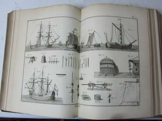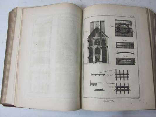 Recueil de planches de l'encyclopédie. Paris: Panckoucke, 1787-1804. Plate volumes 4-5, & 7-8, engraved plates, boards and half calf, spotting and occasional marginal staining, some boards loose or missing, 2 part volumes; Recueil de planches de botanique de l'Encyclopédie. Paris. 1823. Part 1 only, lacking boards; and miscellaneous text volumes in very poor condition (quantity)