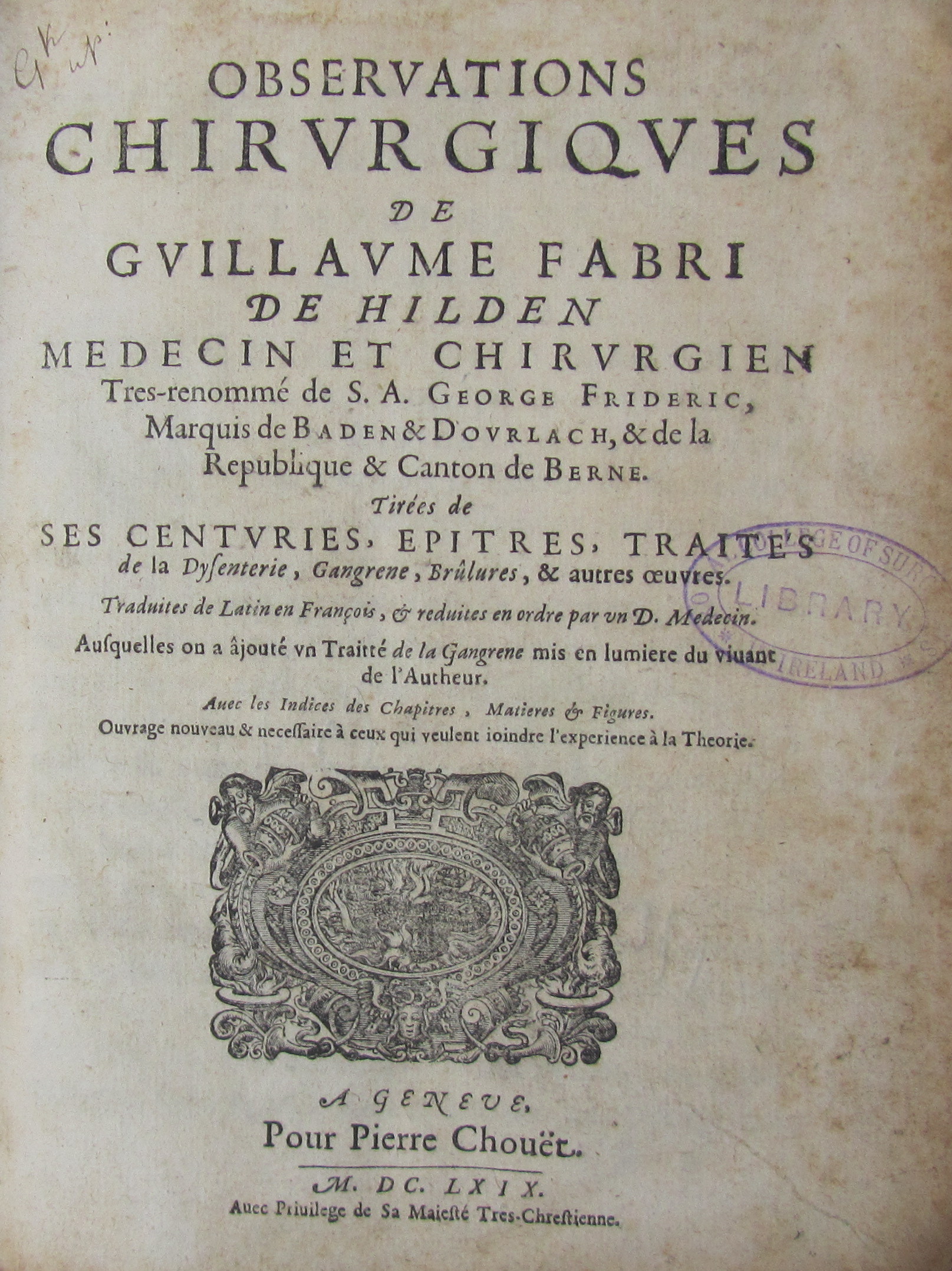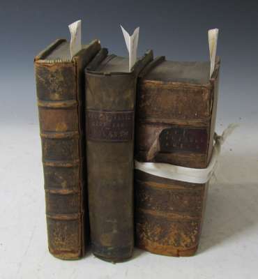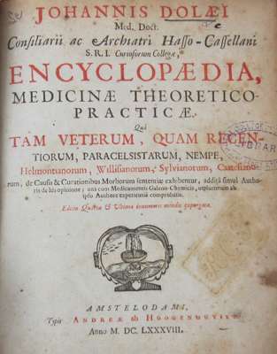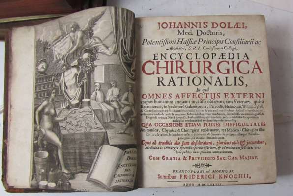 Observations chirurgiques... Geneva: Pierre Chouet, 1669. 4to, 16 engraved plates, library stamps to title, contemporary calf, worn, bookplate; Dolaus, Johann Encyclopaedia medicinae... Amsterdam: A. de Hoogenhuysen, 1688. 4to, title in red and black, dedication, library stamps, contemporary vellum, soiled, later labels; [Idem] Encyclopaedia chirurgica rationalis... Frankfurt: F. Knoch, 1689. 4to, engraved frontispiece, title printed in red and black, portrait, first two signatures [including frontispiece and title] trimmed at upper edge, later calf, worn, hinges splitting (3)