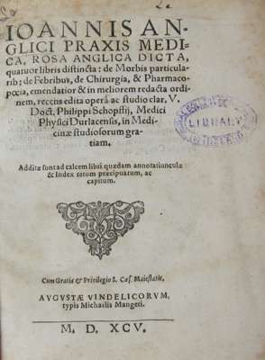 Praxis medica , rosa Anglica dicta... Augsburg: Michael Manger, 1595. 4to, 2 volumes, )(4 .)(.4 A-Z4 Aa-Zz4 AAa-ZZz Aaaa-Nnnn Oooo6 Pppp-Zzzz, 5A-5Z4 6A-6Z4 7A-7N4 7O2, to Oooo6 p.668 only, library stamps, contemporary limp vellum, stained, later morocco labels (2)