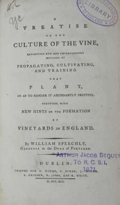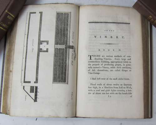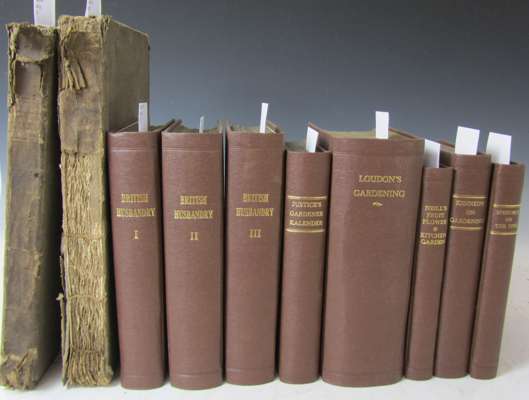 A treatise on the culture of the vine. Dublin, 1791. 8vo, half-title, 5 engraved plates, one folding, cloth; Kennedy, John A treatise upon planting, gardening... Dublin, 1784, 8vo, cloth; Neill, P. The fruit, flower and kitchen garden. Edinburgh, 1840. 8vo, cloth; Justice, James The British gardener's new director. Dublin, 1771. Fifth edition, 8vo, 7 engraved plates, several folding, cloth; Loudon, J.C. An encyclopaedia of gardening. London, 1825. 8vo, illustrations, cloth; Library of useful knowledge British husbandry. London, 1834-40. 3 volumes, 8vo, illustrations, cloth, slight spotting to some volumes; Tableau Encyclopédique et Méthodique. Botanique. Paris: H Agasse, an VIII. 2 volumes only, 4to, plates 401-499 and 801-900 only, original boards, uncut (10)