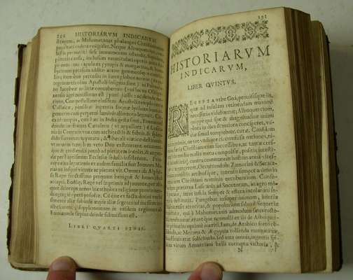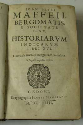Historiarum Indicarum libri XVI. Caen: J. Mangeant, 1614. Small 8vo, title with woodcut device, contemporary mottled calf gilt with coat-of-arms of a French bishop to sides, flat spine richly gilt, gilt edges, a few headlines and page numbers slightly shaved, some preliminary leaves with dampstain, some light spotting, edges and extremities of binding somewhat worn