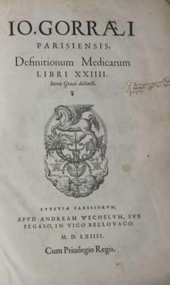 Definitionum medicarum libri XXIIII... Paris: Andreas Wechel, 1564. Folio, *4 a-z6 A-Z6 Aa-Rr6 Ss4, portrait at *iv, folding table at Hh4, printer's device on title and reverse of colophon, ink marginalia, library stamps, calf, worn, boards loose, backstrip very worn, first few and last few leaves loose