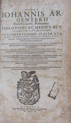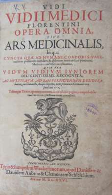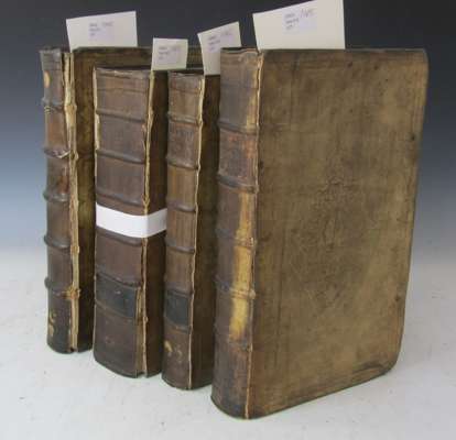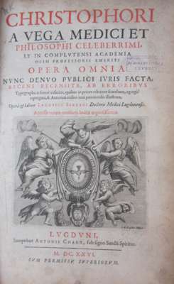 Operum sive artis medicinalis. Frankfurt: Wechel, 1626. Folio, 2 volumes, printer's device on titles, library stamps, contemporary blindstamped vellum, backstrip soiled, hinges cracking, boards loose on volume II heavily browned and soiled throughout, bookplate of Thomas Molyneux of Dublin; Argenterio, Giovanni Opera. Hanover: Wechel, 1610. Folio, printer's device to title, library stamps, contemporary blindstamped vellum, soiled, heavily browned and soiled throughout, bookplate of Thomas Molyneux; Vega, Christopher Opera omnia. Lyon: A. Chard, 1626. Folio, vignette title, library stamps, contemporary blindstamped vellum, soiled, hinges split, lacking ties, some dustmarking to first few and last few leaves but otherwise interior clean (4)