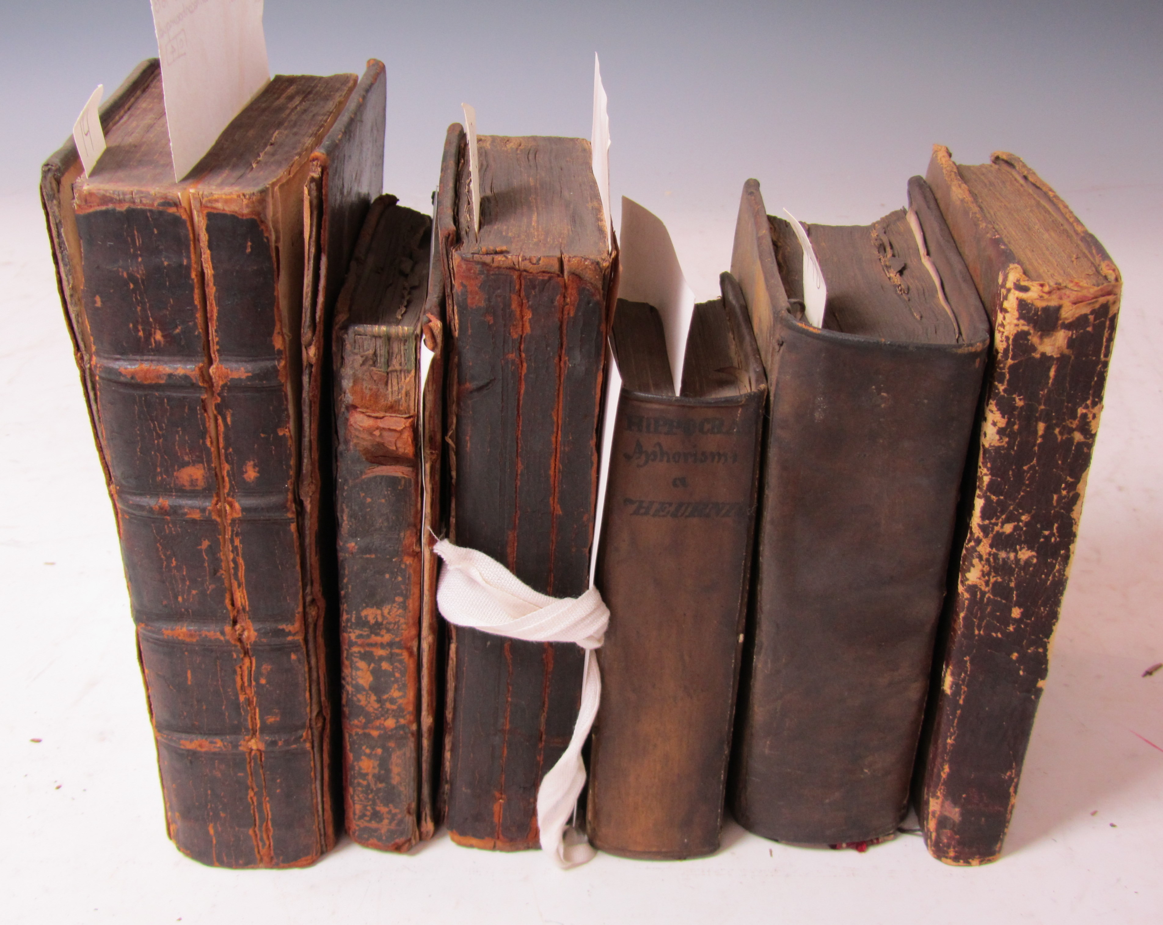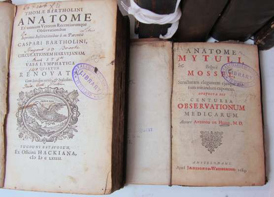 Anatome mytuli, Belgicè mossel. Amsterdam: J. Waesberg, 1684. 12mo, [16], 15 (of 16) folding engraved plates, contemporary calf, upper margin of title and *2 excised, some soiling & browning, worn, upper cover detached; Bartholinus, Thomas Anatome ex omnium veterum recentiorumque observationibus. Leiden: Officina Hackiana, 1673. 8vo, 12 (of 13) folding plates, lacks portrait and engraved title, contemporary calf, text block split, cover detached; and 4 others in poor condition (6)