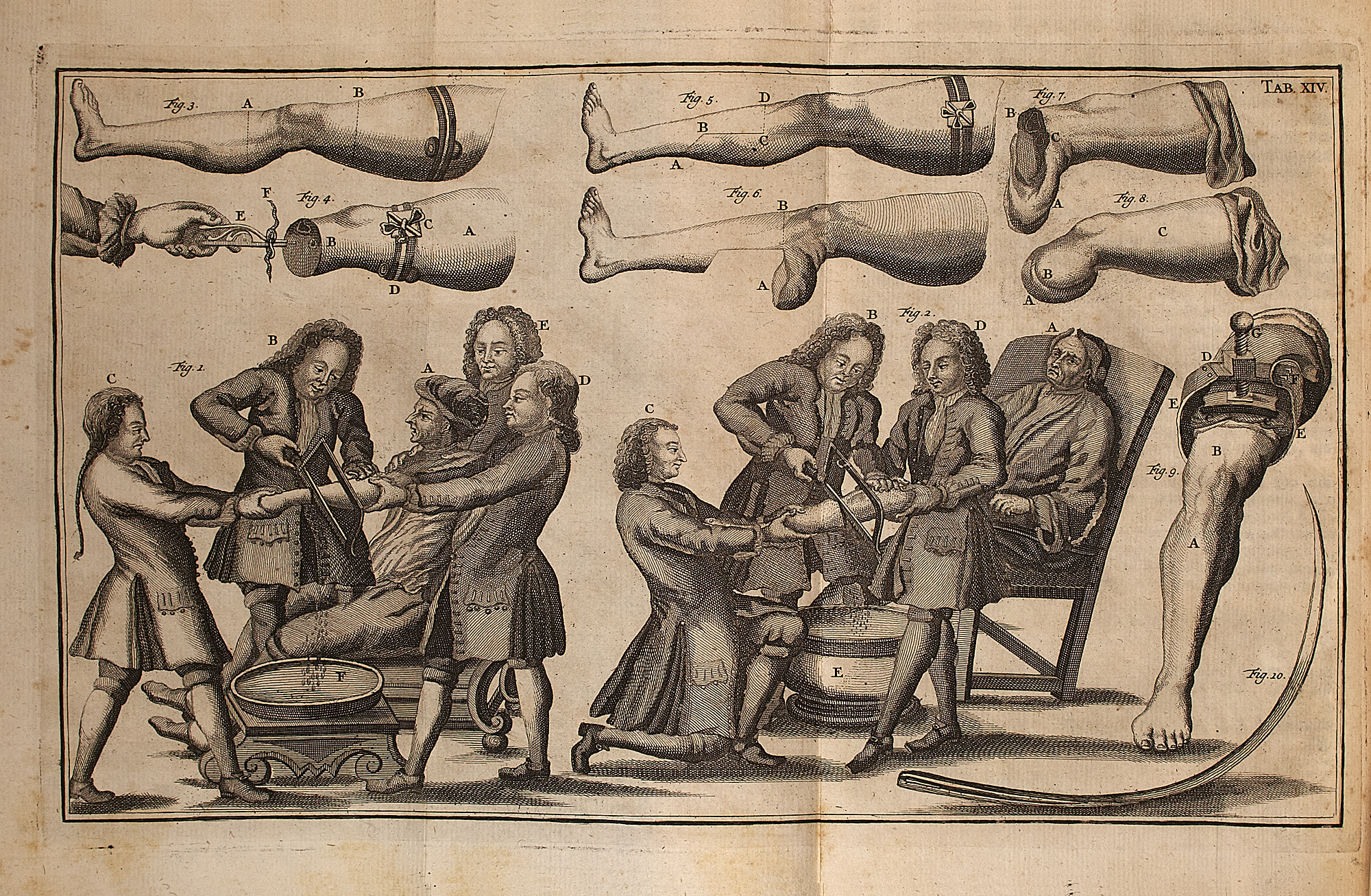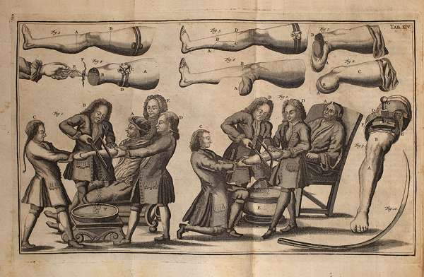 Institutiones chirurgicae. Amsterdam: J. Waesberg, 1739. 2 volumes, 4to, 38 folding engraved plates, lacks portrait, contemporary calf, worn, three covers detached, slight spotting