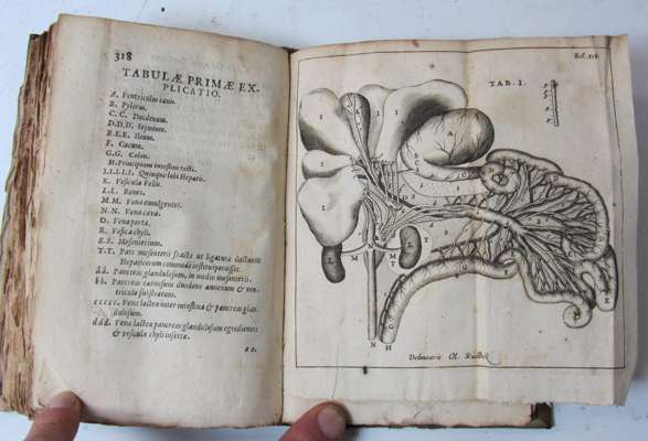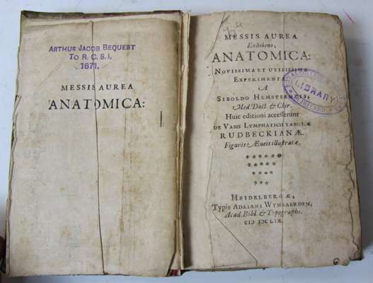 Messis aurea: exhibens; Anatomica: novissima et utilissima experimenta. Heidelberg: A. Wyngaerden, 1659. 8vo, xvi, 370, 24; additional engraved title and 19 engraved plates, some folding, early calf-backed boards, uncut, engraved and printed title loose, printed title with some loss of inner margin (with no loss of text), occasional browning, rubbed