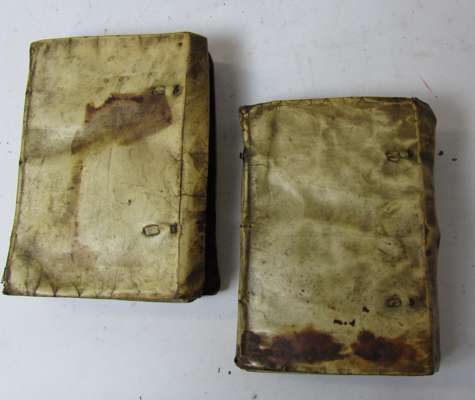 Opera quae as nos extant omnia... Basel: Froben, 1554. 8vo, 2 volumes, I. pp.859, *8 a-z8 A-Z8 Aa-Hh8, II. pp.659, a-z8 A-Y8, printer's imprint to titles and colophons, library stamps, contemporary limp vellum, stained, torn at hinges, inner hinges and endpapers loose and torn, some foxing and staining (2)