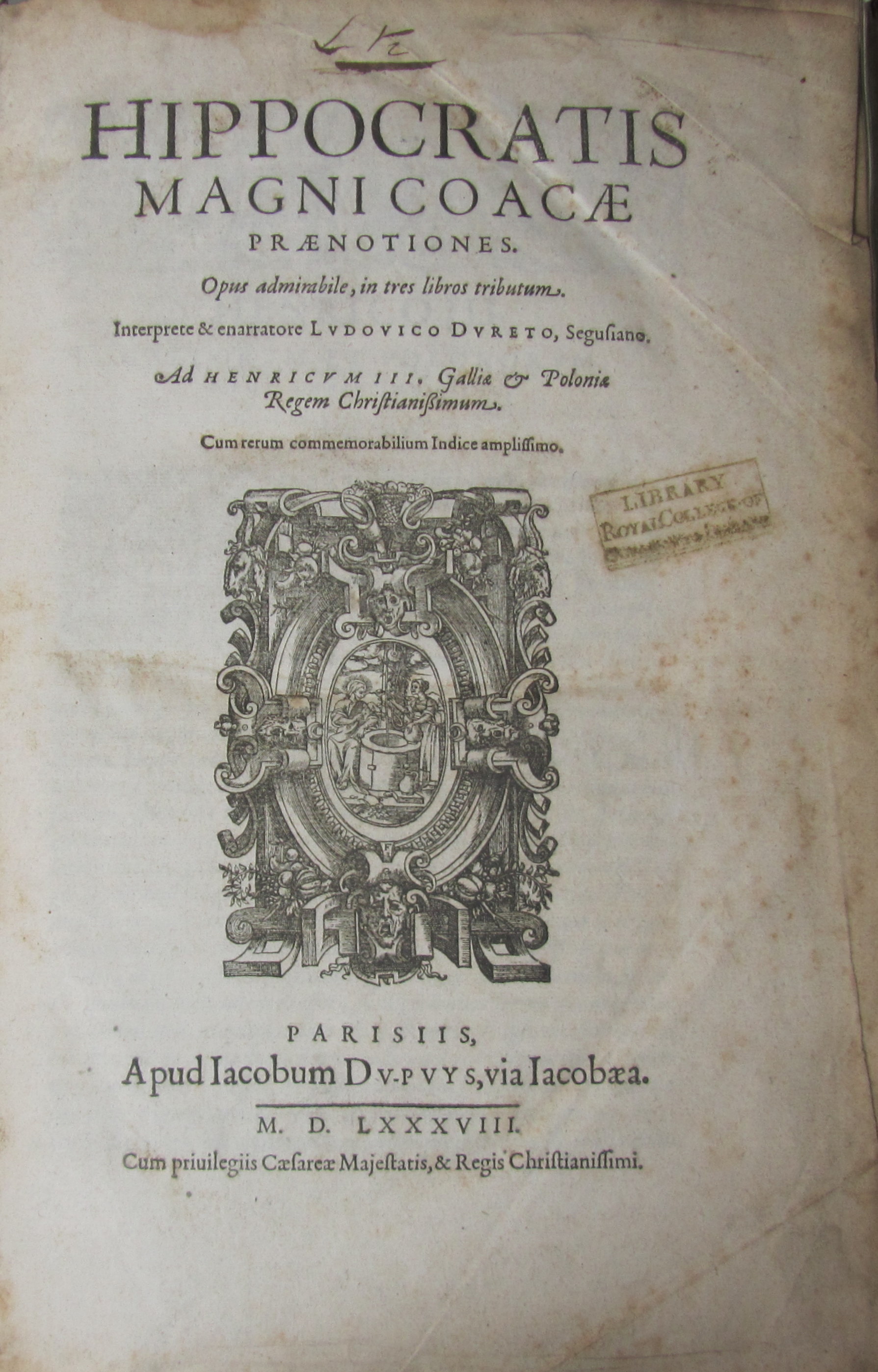 Magnicoaecae praenotiones.... Paris: Baptiste Dupuys, 1588. Folio, a6 A-Z6 Aa-Zz6 Aaa-Ggg6 [Ggg6 blank], woodcut to title, library stamps, contemporary vellum, labels removed, waterstaining to upper edge, early seventeenth century ink inscriptions to front fixed endpaper
