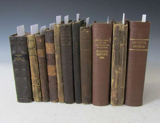 A course of chymistry. [?London: W. Kettilby, 1698]. 8vo, calf, rebacked, lacks title, preliminaries dampstained, [Wing L1040]; British Association for the Advancement of Science Report of the fourth meeting. London, 1835. 8vo, cloth; Idem Report of the fifth meeting. London, 1836. 8vo, plates, original boards, rubbed, upper cover detached; Arnott, Neil Elements of physics. London, 1828. 8vo, cloth; Liebig, J. Chemistry in its application to agriculture and physiology. London, 1842. 8vo, original cloth, spine discoloured; Idem Researches on the chemistry of food. London, 1847. 8vo, original cloth, some spotting, boards marked; Idem Animal chemistry. London, 1842. 8vo, original cloth; Wood, James The elements of mechanics. Cambridge, 1841. 8vo, original boards, worn; Nicholson, William A journal of natural philosophy, chemistry and the arts. London, 1803. 8vo, engraved plates, contemporary half calf, some spotting, rubbed; Dickson, Stephen An essay on chemical nomenclature. London, 1796. 8vo, contemporary calf, some spotting; Chenevix, R. Remarks upon chemical nomenclature. London, 1802. 12mo, original boards, title soiled, boards worn and soiled (13)