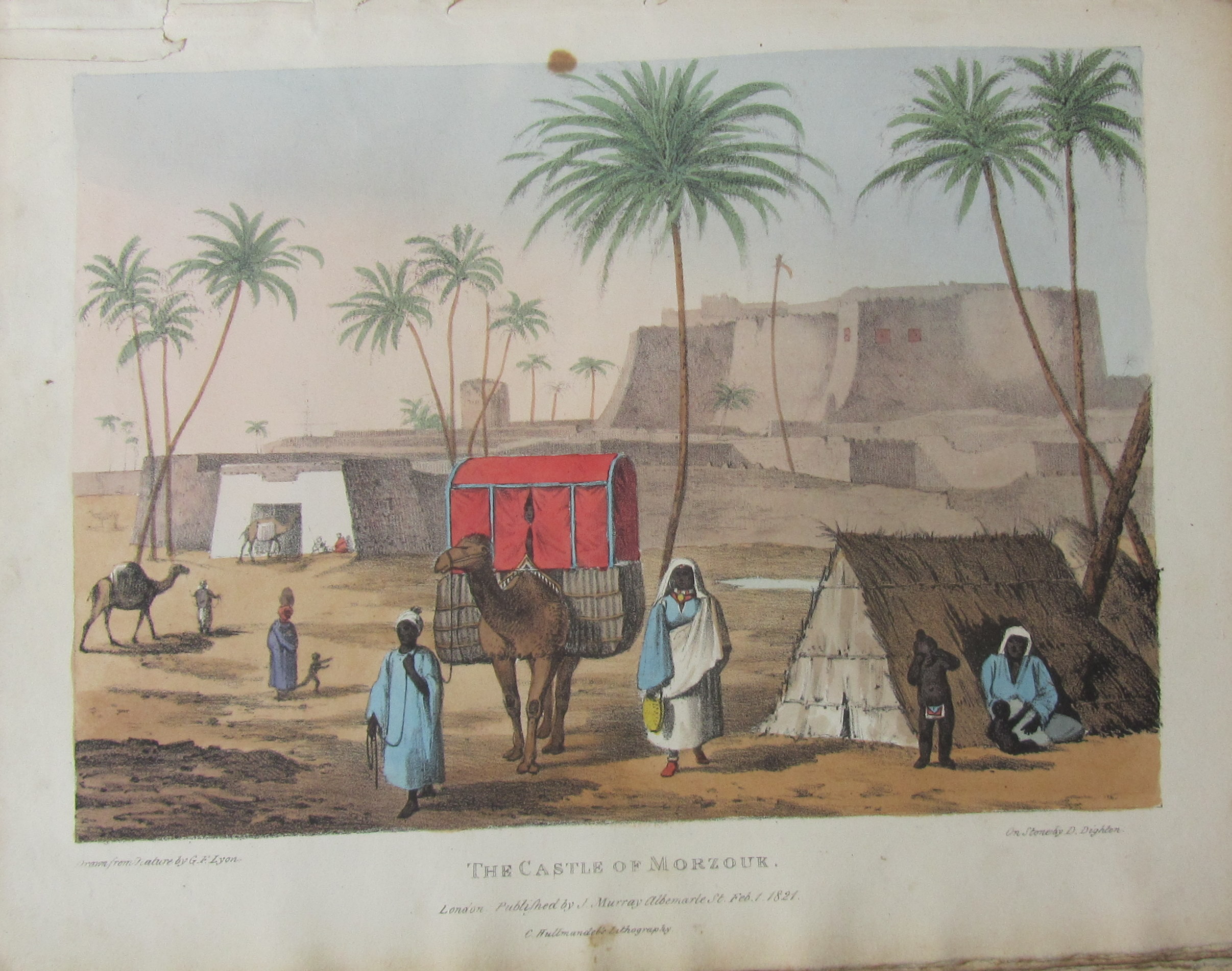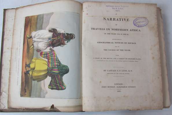A narrative of travels in Northern Africa, in the years 1818, 19 and 20. London: John Murray, 1821. First edition, 4to, folding map and 16 (of 17) hand-coloured lithographed plates, original cloth-backed boards, slight loss to frontispiece margin, title slightly dusty and with library stamp, worn, joint split