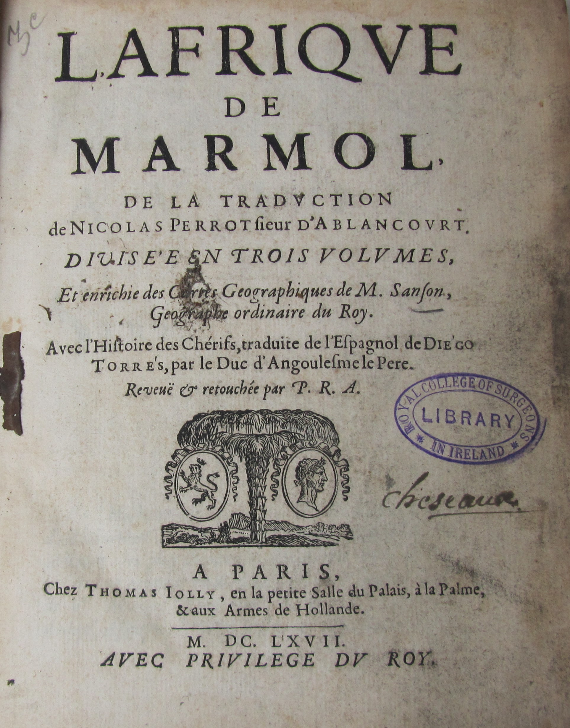 L'Afrique de Marmol. Paris: T. Jolly, 1667. 4to, volume 1 and 2 only (of 3), 16 (of 28) folding maps, contemporary calf, spotted and soiled, worn, covers detached