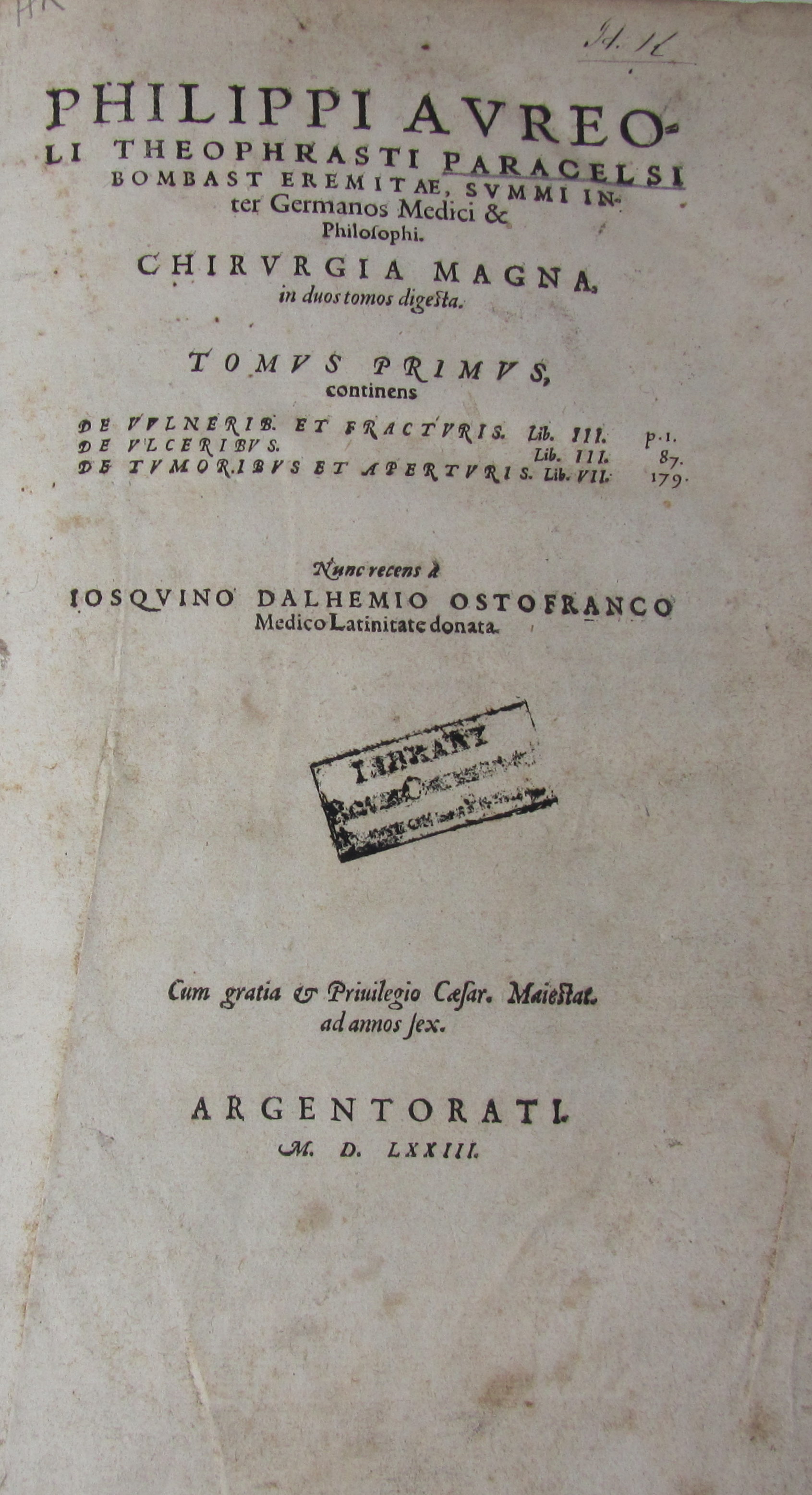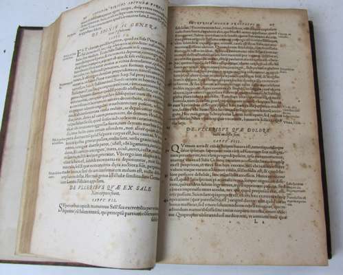 Chirurgia magna... [pr. Basel: P. Perna], 1573. Folio, 3 parts in one volume, )(6 A-S6 T4 V6 X8; Aa-Zz6 aaa6; Aaa-Yyy6 Zzz3, lacking Zzz4 blank, library stamps,waterstaining and foxing throughout, later calf, worn, boards loose