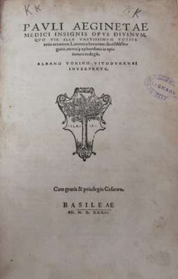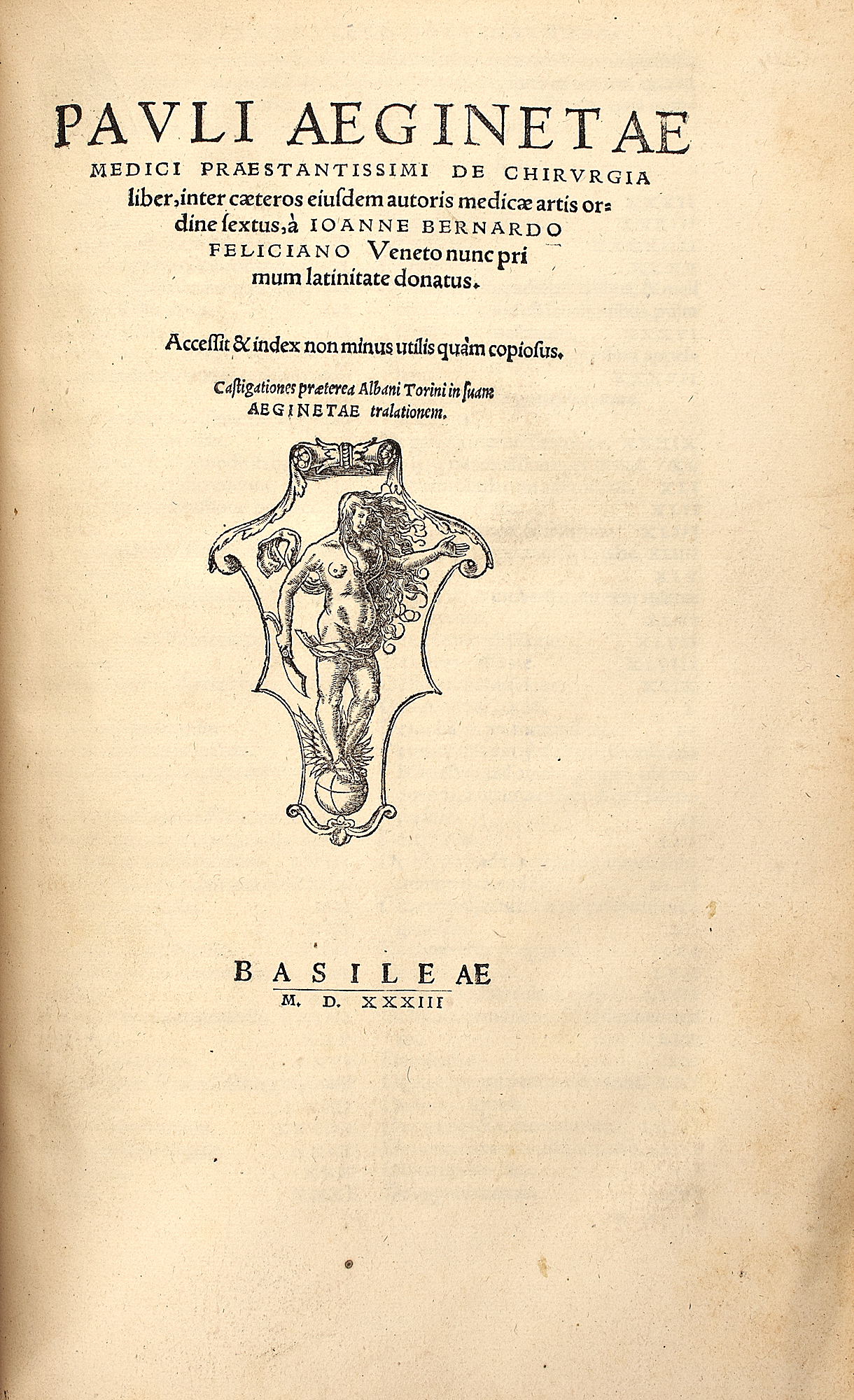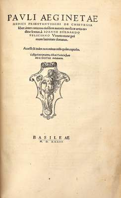 Opus divinum, quo vir ille rastissimum totius artis oceanum.... Basel: [Cratandrum & Bebelium], 1532. Folio, a4, ß6 a-z6 A-V6, printer's device on title and colophon, library stamps, title loose; [bound with] [Idem] De chirurgia liber, inter caeteros eiusdem autoris medicae artis... Basel: Bebelium, 1533. Folio, a-f6, printer's device to title and colophon, calf, worn, rebacked