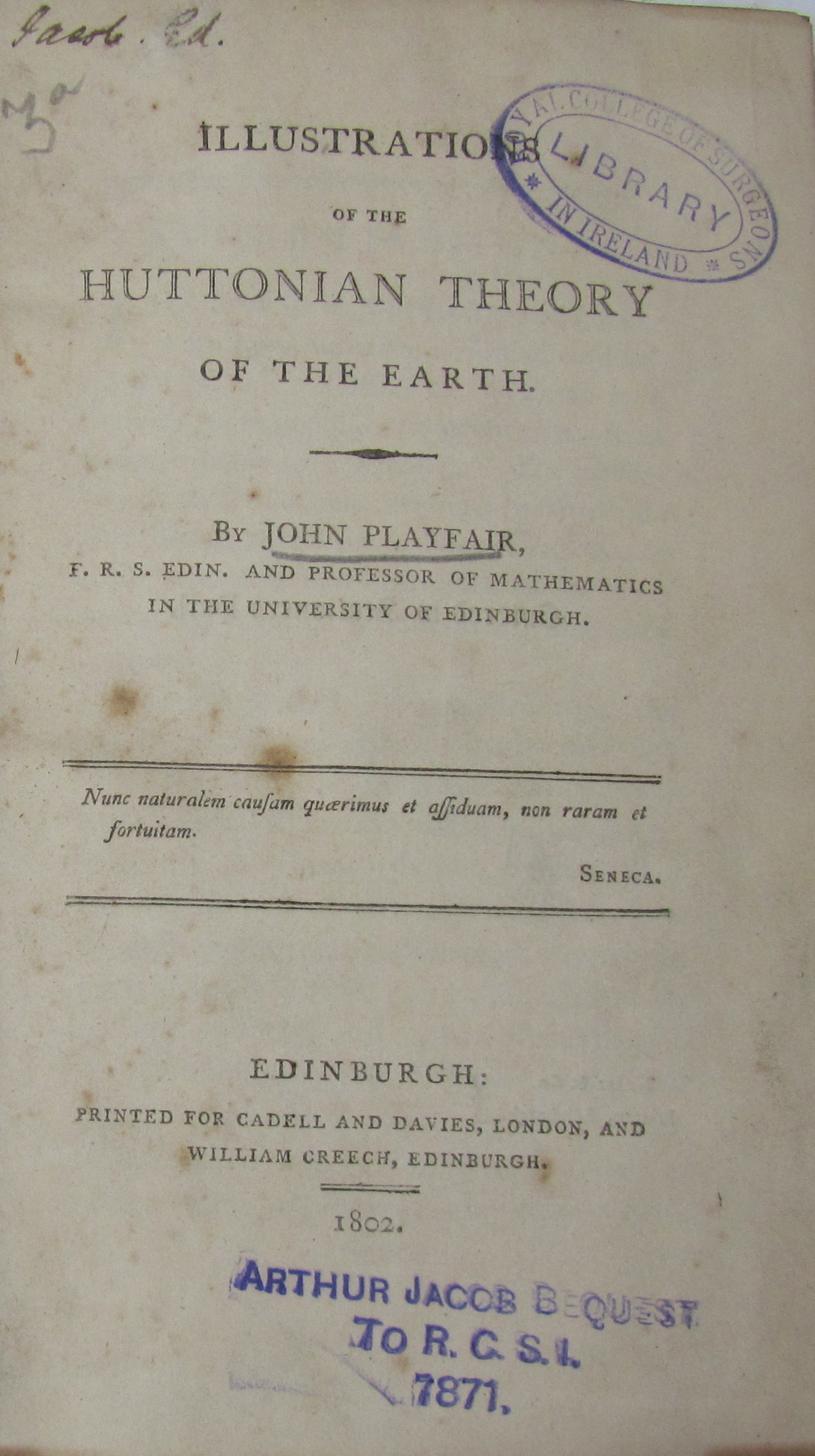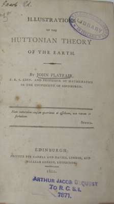 Illustrations of the Huttonian theory of the earth. Edinburgh: Cadell and Davies, 1802. First edition, 8vo, xx, 528, contemporary half calf, two stamps and inscription to title, some spotting, worn, cover detached