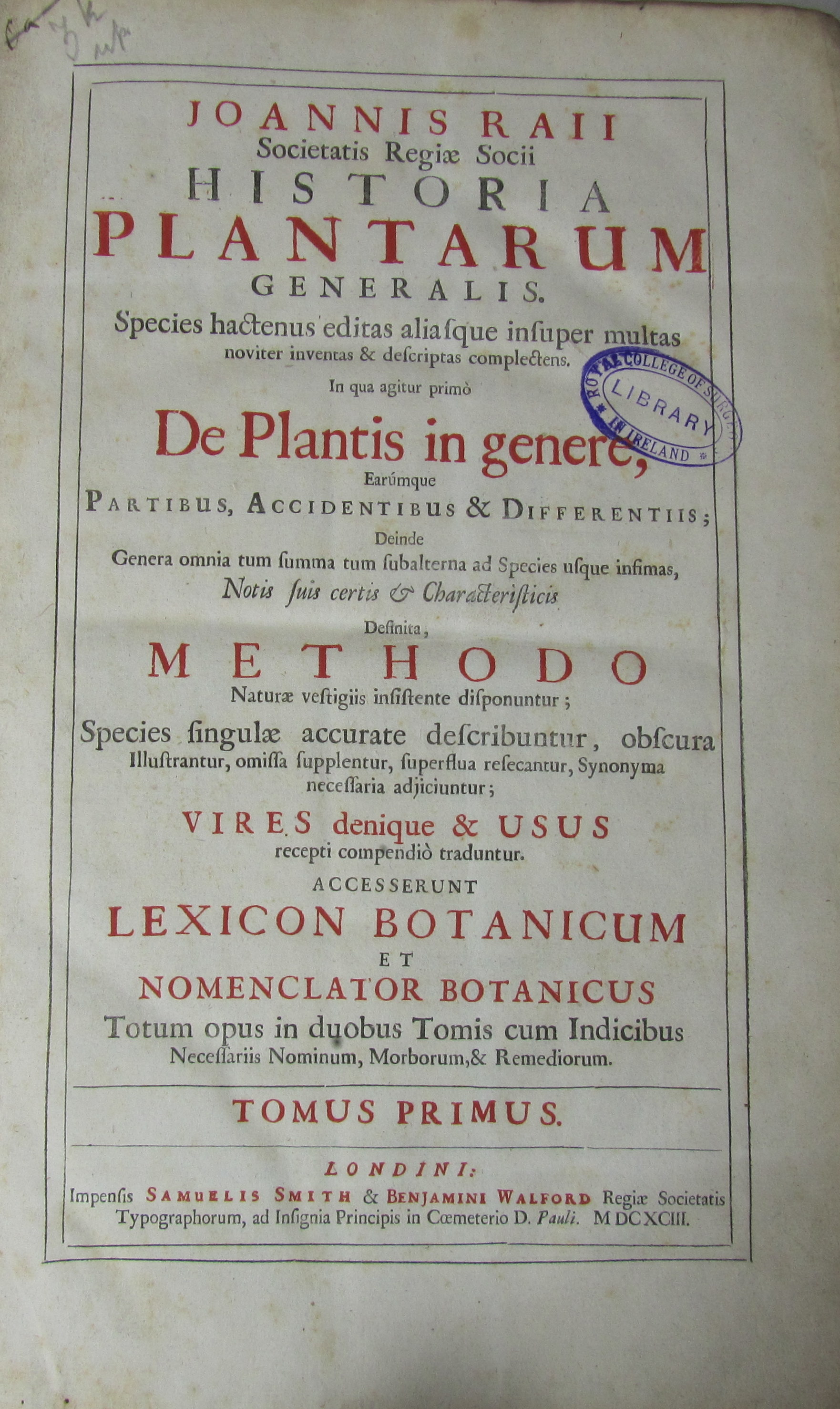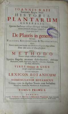 Historia plantarum. London: S. Smith & B. Walford, 1693. Volume 1 and 2, folio, titles printed in red and black, contemporary calf, worn, a little light worming to lower margin of volume 2, volume 2 lacks spine